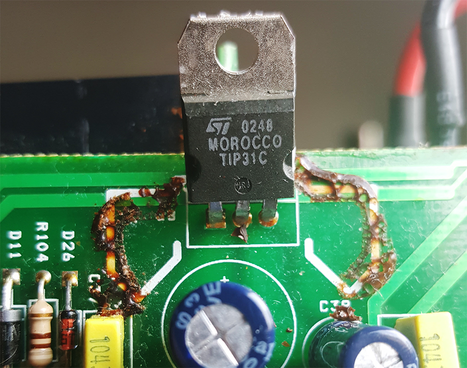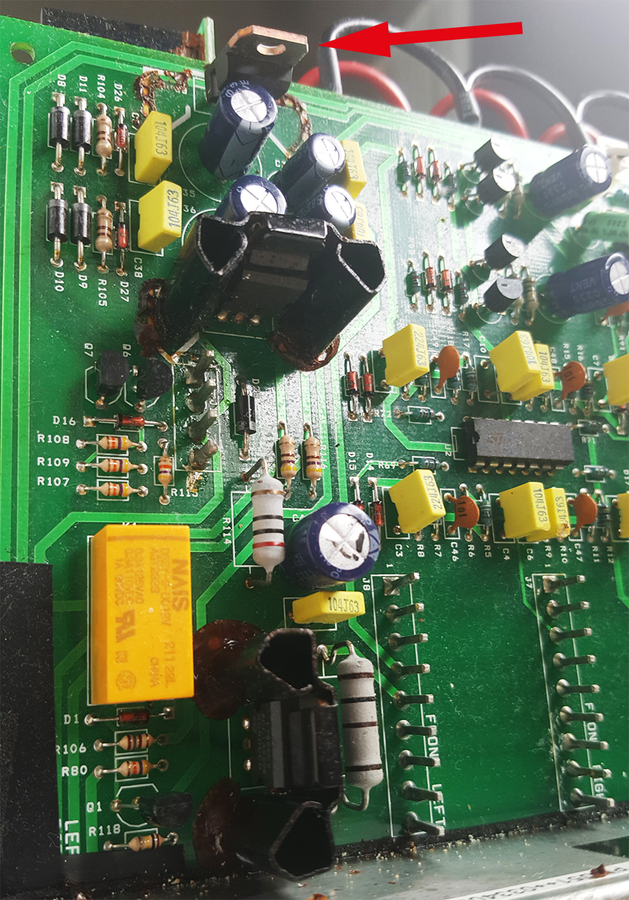 I noticed there is a missing metal clip that was attached to 1 of these MOSFETS in the photo below. I found the metal heatsink in the subwoofer box, so I might be able to stick it on there with some thermal tape or something. Those three mosfets seem to be different however... The one that is missing the heatsink reads "ST 0248 MOROCCO TIP31C" and a google search lead me to THIS PAGE.