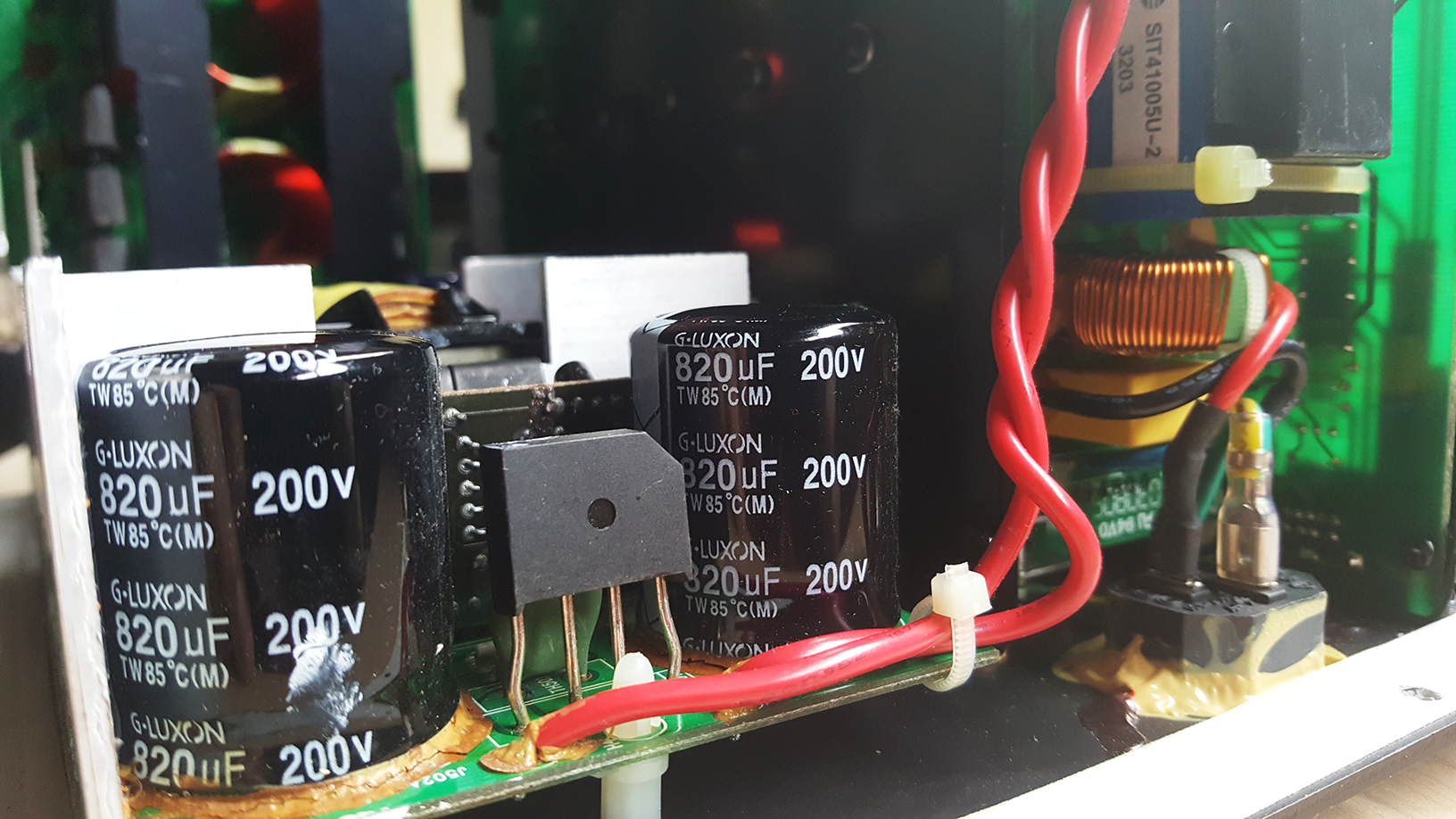 I looked at all the caps and one is clearly bulging. These are the biggest and seem to be 820uF 200V. The one next to it on the left doesn't seem to be bulging, but I guess might as well do both..?