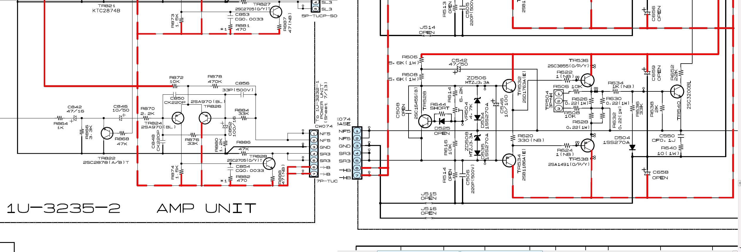 At first glance, this time, it blew only the power transistors and few resistors ( R622, R620, R624 and most likely the emitter resistors ). The pre-stage ones ( tr534/532 ) seem to be fine and currently the receiver is working with them on the board ( but with removed R620 ).