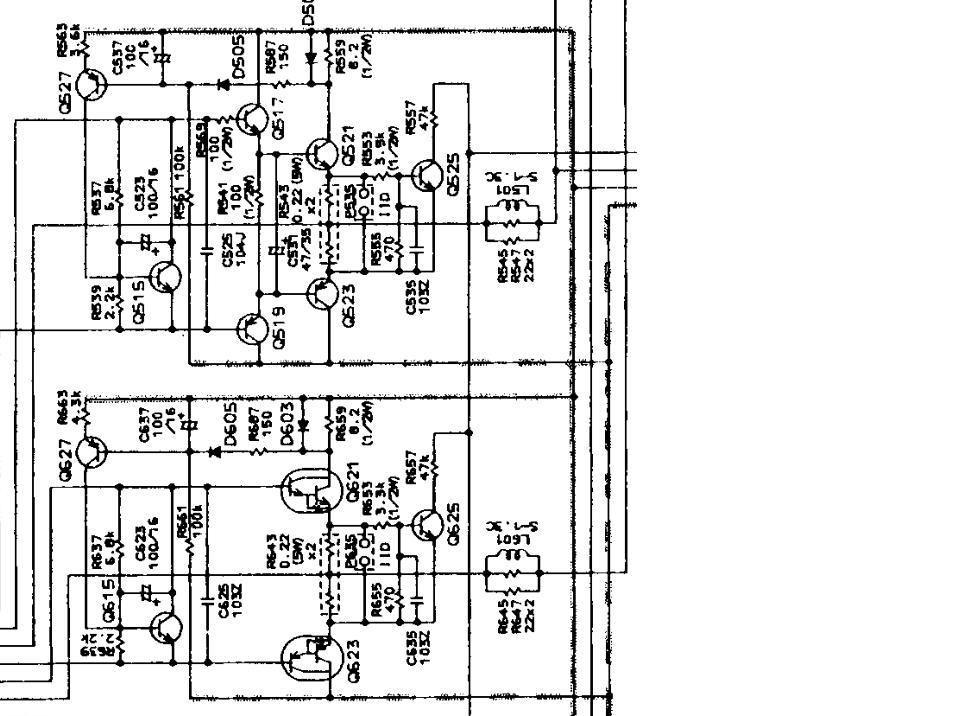But, i also found, somebody else has been in here. Looks like the output transistors have been replaced at one time, and a pretty rough solder job on the bottom. Even more troubling, something in here looks to have caught fire! Or at the very least, heated up enough to disrupt the traces on the board. Somebody did a solder slob job + jumper wire.