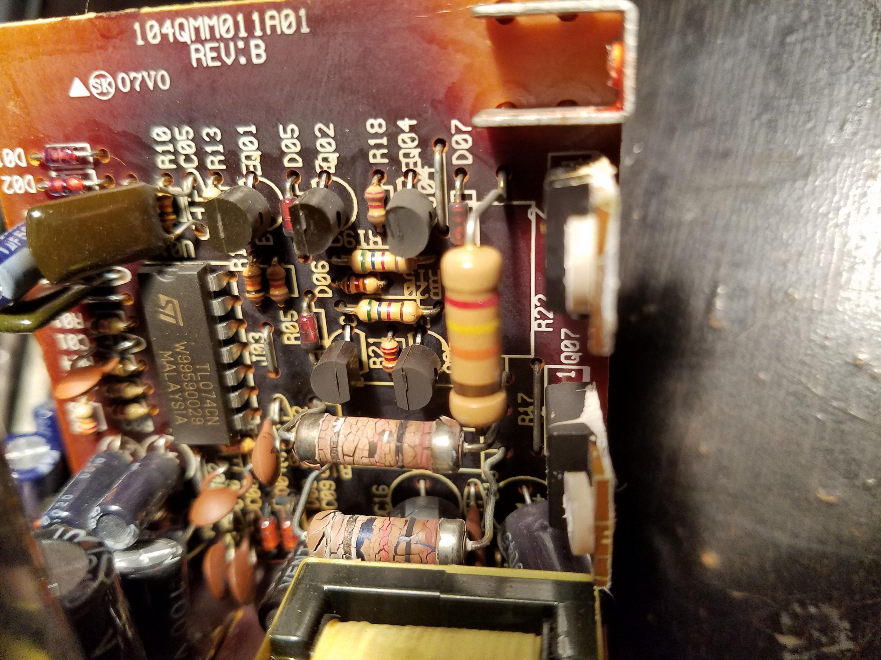 Opened it up, and was greeted immediately with two overheated 1W resistors on the sub amp/power supply board.