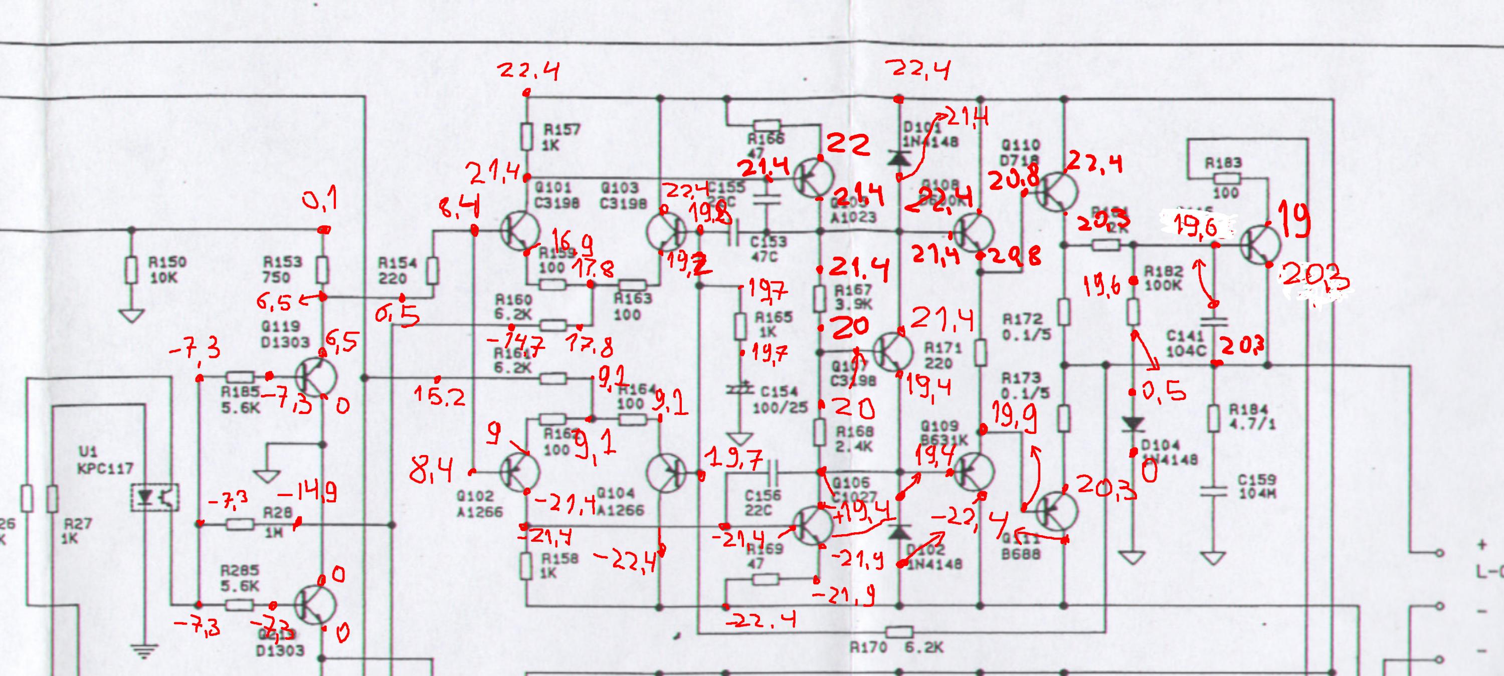 Also look at the Q107, Q109: You show +19.9V at the Emitter of Q107 and +19.4 at the BASE of Q109 which is impossible since the Emitter of Q107 is DIRECTLY connected to the BASE of Q109, so how can you have TWO different readings?
