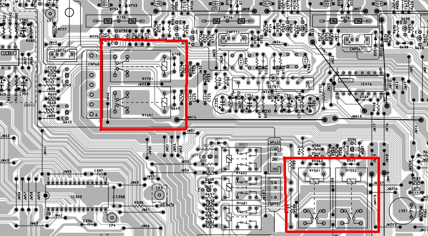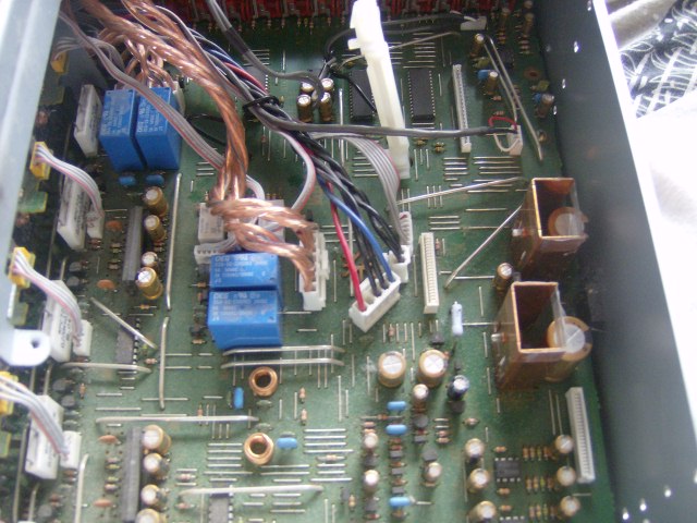 I had researched the problem on the Net beforehand. This relay thing is a somewhat common problem with these receivers it seems. The speaker protection relays solder joints becomes bad with age. I opened it, pulled every board out to get to the bottom one. There was four blue components that upon googling the designation indeed showed themselves to be the speaker protection relays.