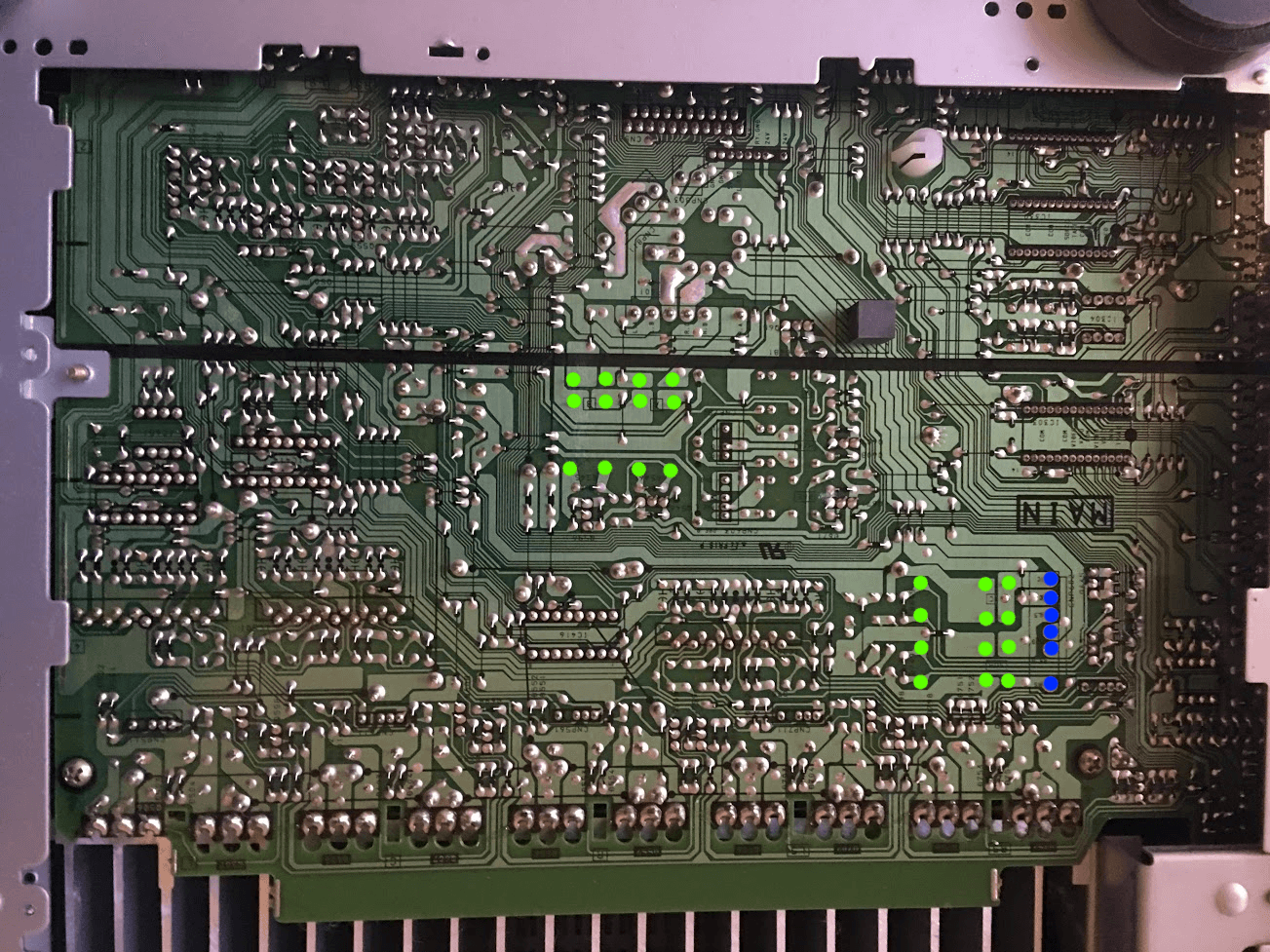 The channel volumes seem more consistent and balanced and (maybe its just psychosomatic) but the quality seems to have improved somewhat. The amp is definitely 'different' to how it was, but I can't quite put my finger on it. I'm so pleased with this fix because it was beautifully easy and has given a new lease of life to my ol' DB940. As my small contribution to give back to this community and thread as thanks for the wonderful fix, I've taken some nice higher resolution pictures of the board, and re-annotated them with the solder locations in a different colour to red as due to my colour-blindness I had a bit of trouble with. JPG compression doesn't do any favors to board-shots so I've uploaded it as a PNG instead.
