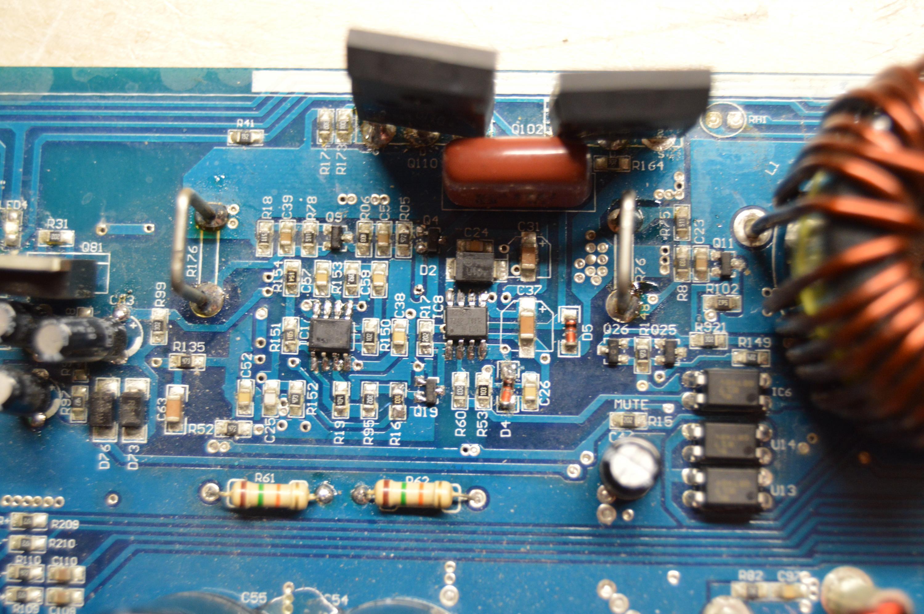 The ICs on the bottom are class D amps ( https://cdn.badcaps-static.com/pdfs/...62d01324be.pdf ). Looks like that amps have internal protection which also provides some feedback ( DIAG pin ) to the rest of the circuit.