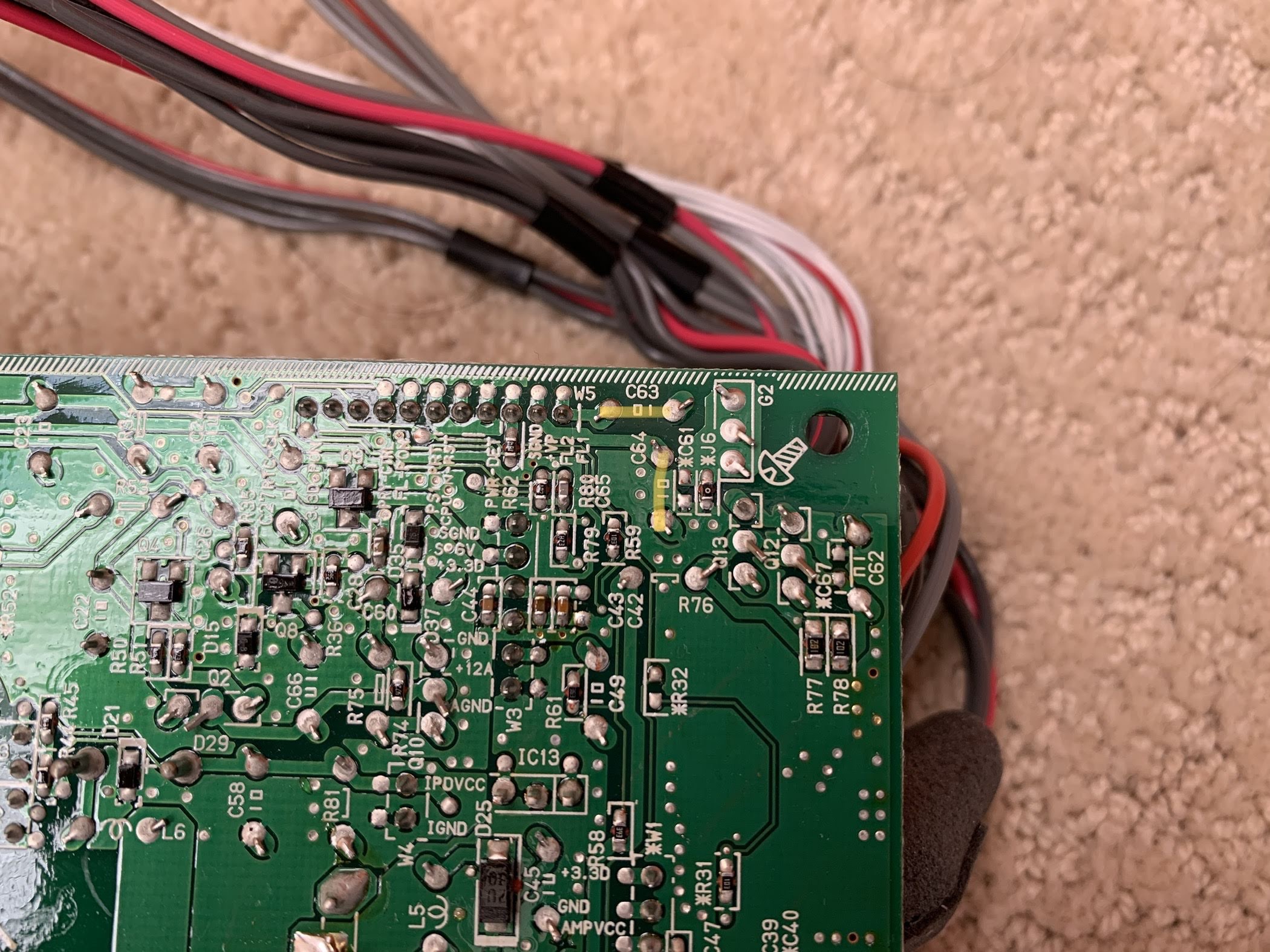 ......o The voltage between pin1 and pin4 (C63) and between pin2 and pin4 (C64) of connector W5 (top right of power supply board when looking at the back side of the board; pin1 is toward the right) was: