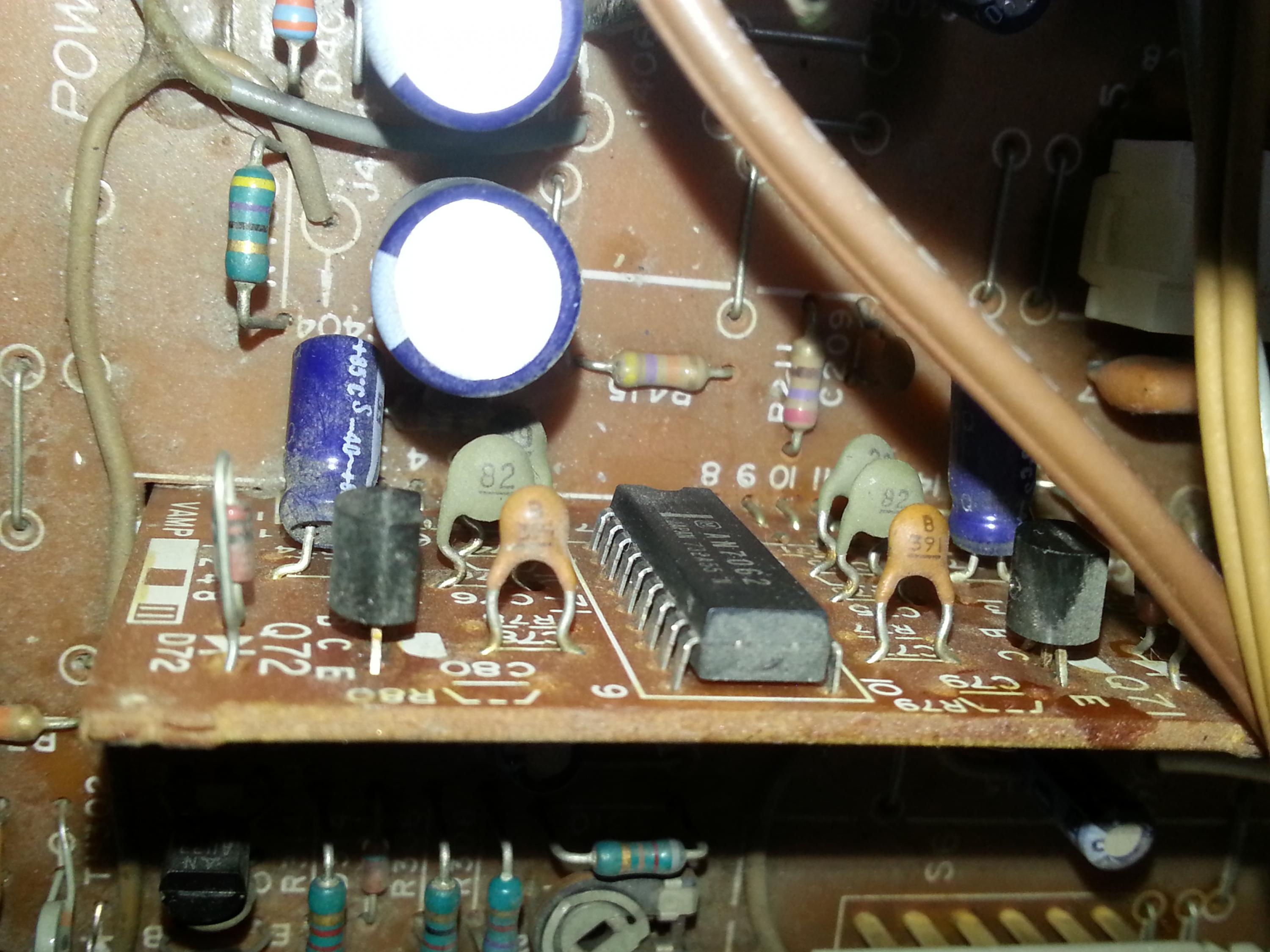 My next two targets are C71 and C72 which feed the inputs L and R to that IC. I don't have 3.3uF caps on hand at the moment, so we wait until Monday