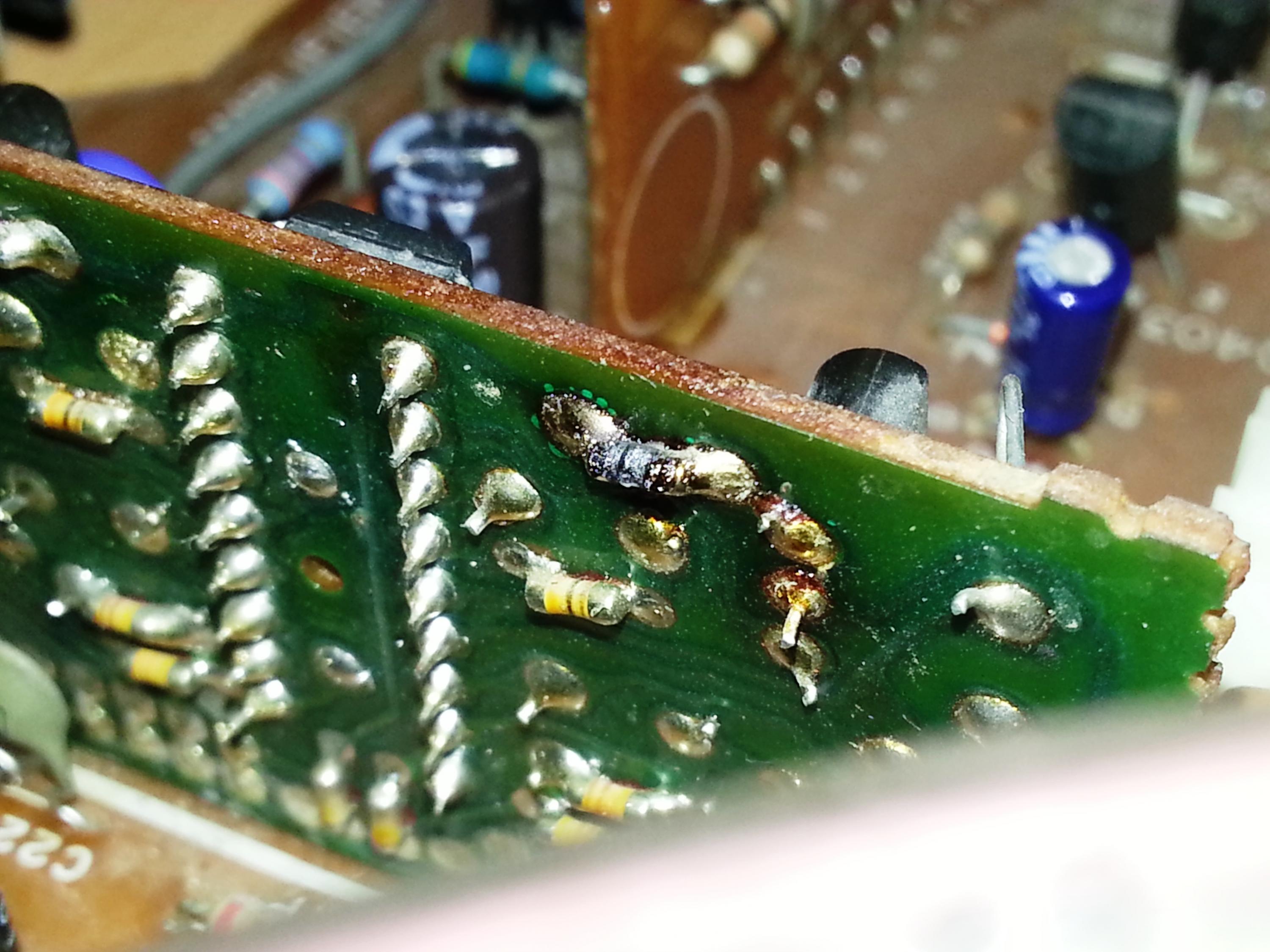 I can't quite figure out why the sound card died though. I suspect IC71 also died because to travel back into the sound source, the current must've somehow reached pin 10 of the riser and from what I can see it can only do that through IC71, though I didn't read any shorts there either. In the second picture, you can just about make out a bit of solder sputter on pin 17 of the IC which wasn't there before - must've got hot.