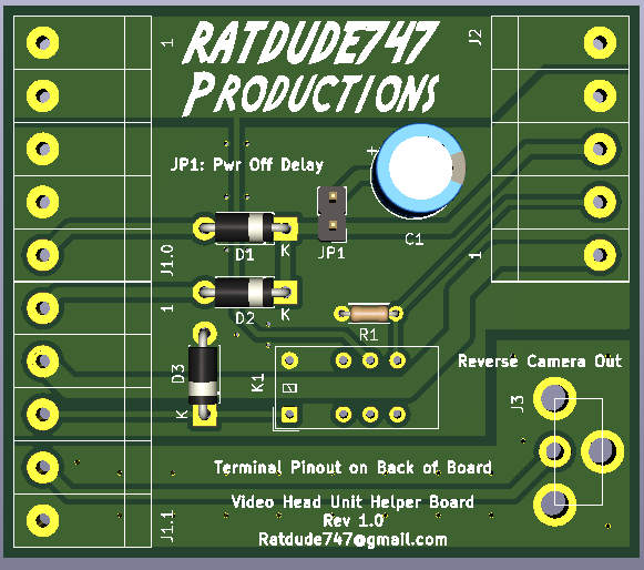 - Eliminates the solder splices in the reverse camera cable. Due to the way my reverse camera is made (and the craptastic RCA plug they used), there used to be crimp splices on my RCA camera cable to allow it to enter the firewall via an existing grommet (for the shift cable). Those crimps failed, and I soldered it... and re-soldered it when I moved to a different Ranger. A short female-female RCA cable is needed to interface the board with the RCA jack on the board. No idea how well this will work; I didn't impedance analyze the relevant portion of the board (but I did via stitch the shield planes at least). I've seen composite video work on sketchier setups... we shall see. EDIT: Short RCA cables don't exist pre-made, but male-male couplers exist, which in my case, will work (if memory serves, my camera input is on a pigtail). Worst case I use a longer cable and coil it... or cut and re-plug it.
