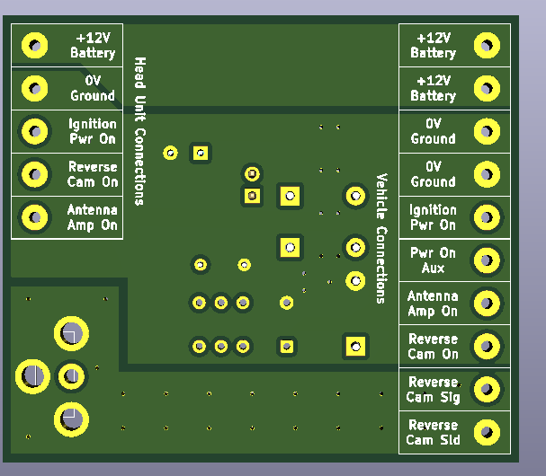 - Eliminates all current harness splices in my setup. To facilitate this, two ground terminals on the vehicle side are provided (since I'm using an RCA adapter for my audio, which feeds the factory amp). The Antenna/Amp signal is routed through the board to allow for such, and the terminals and (hopefully) the power/ground fill areas are rated for the 15A the head unit maxes at (fuse rating).