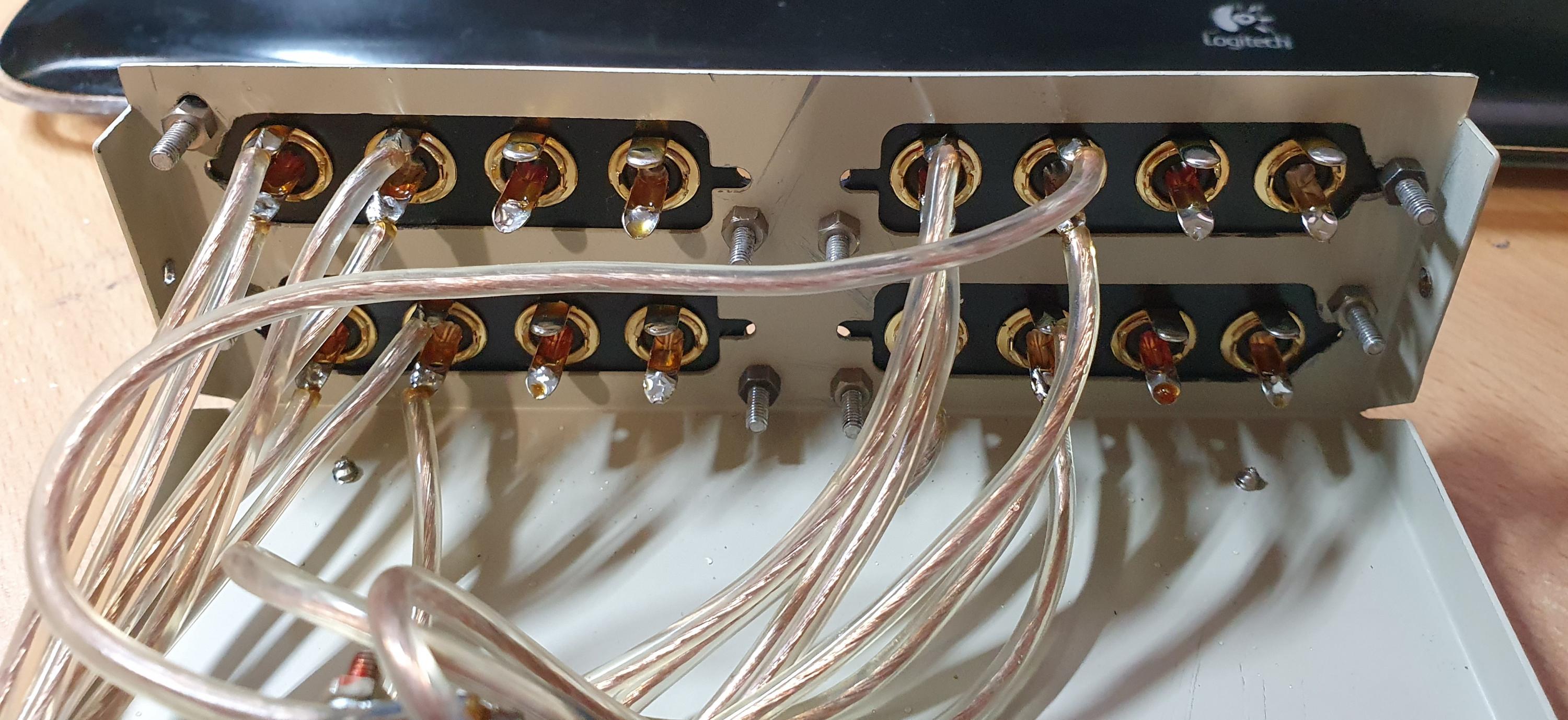 3x PC's sound card out (line) to switch box then 1 out to stereo mixer then main out on mixer to powered speakers