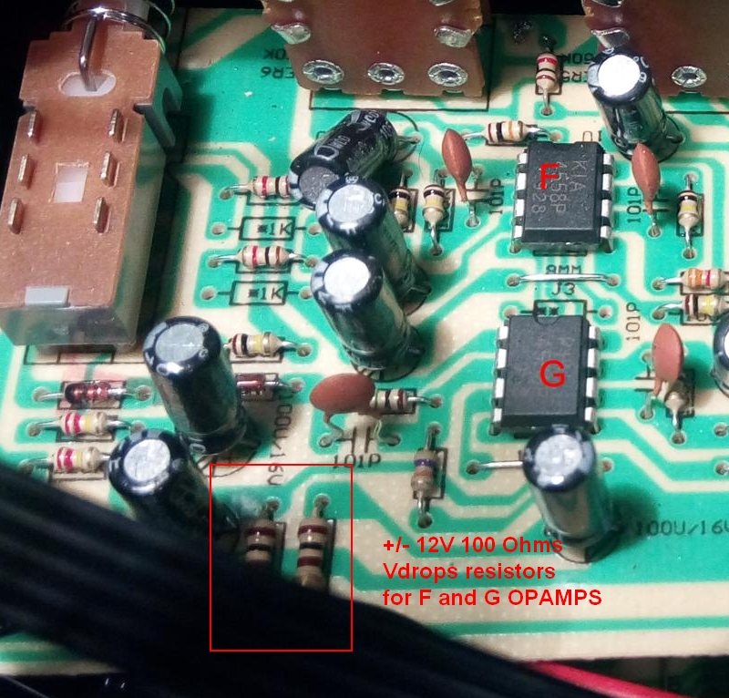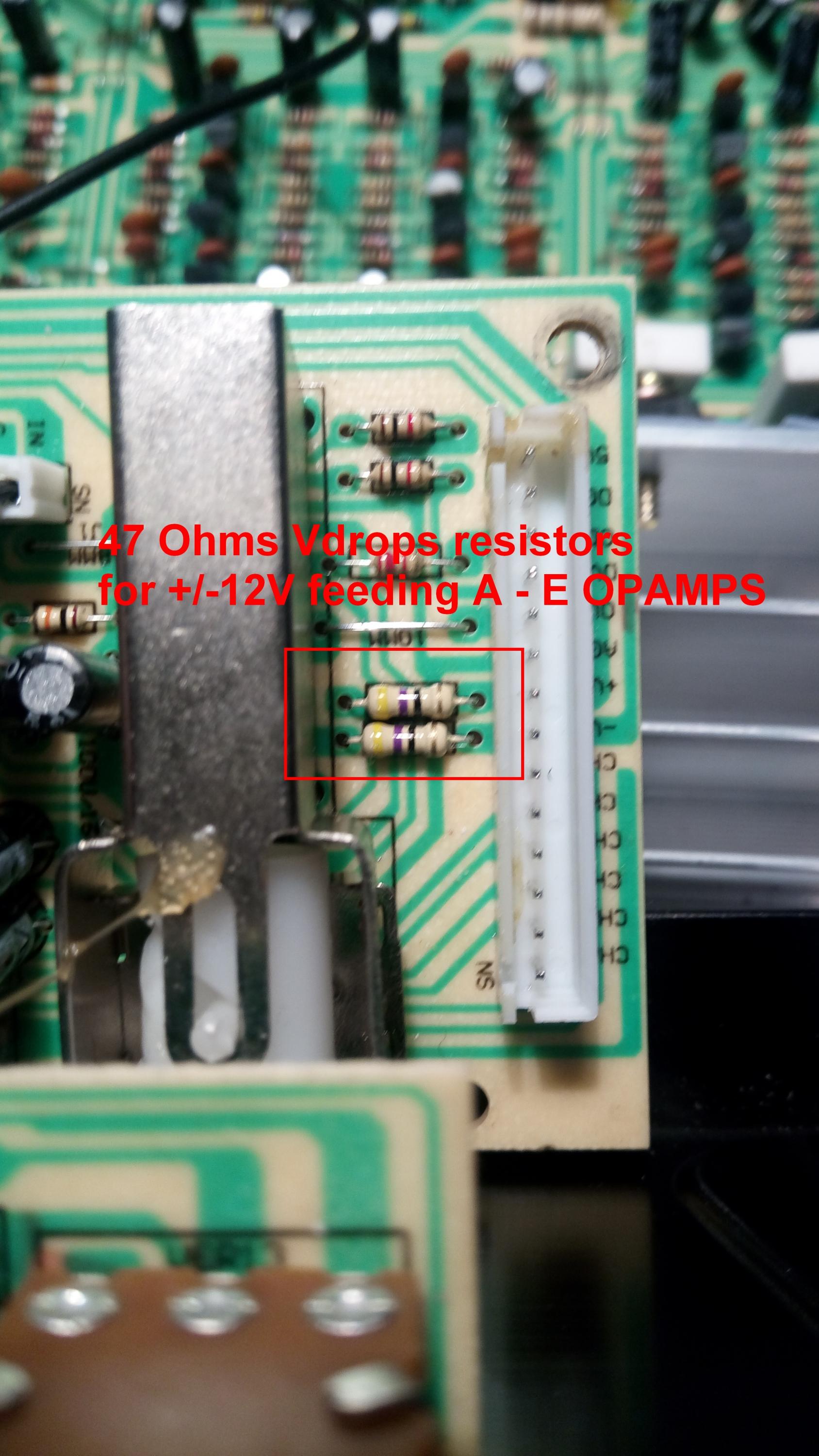 2) Lift one end of each 47 Ohms resistors that feed +/- 12V to OPAMP A ~ E, this will isolate the OPAMP A ~ E from +/- 12V power supply, so the only loads we have will be OPAMP F ~ G, CD IC, and LED indicator lights. See picture attached.