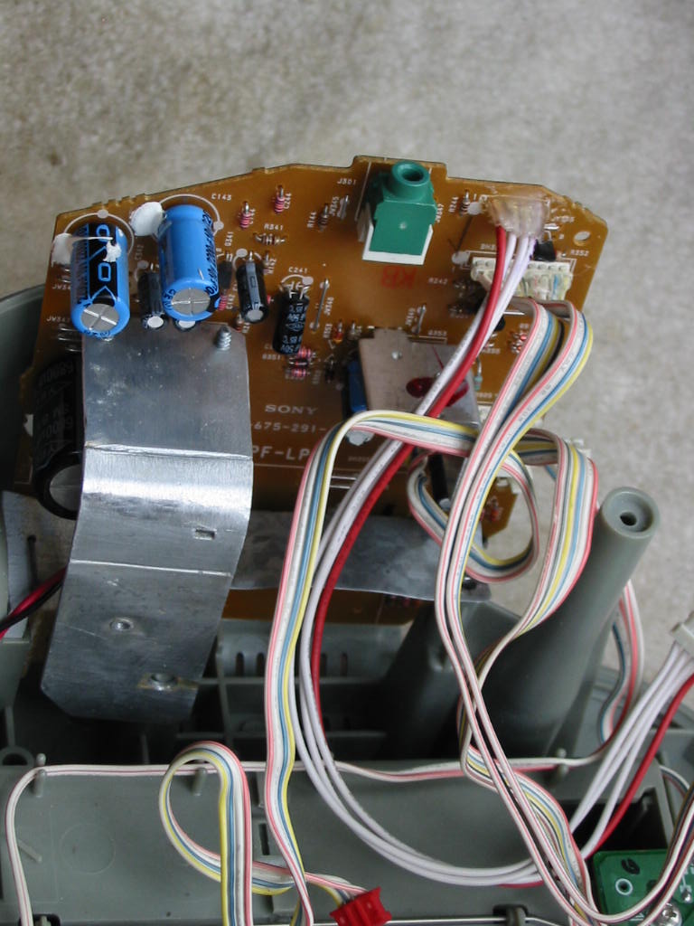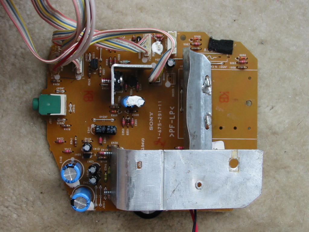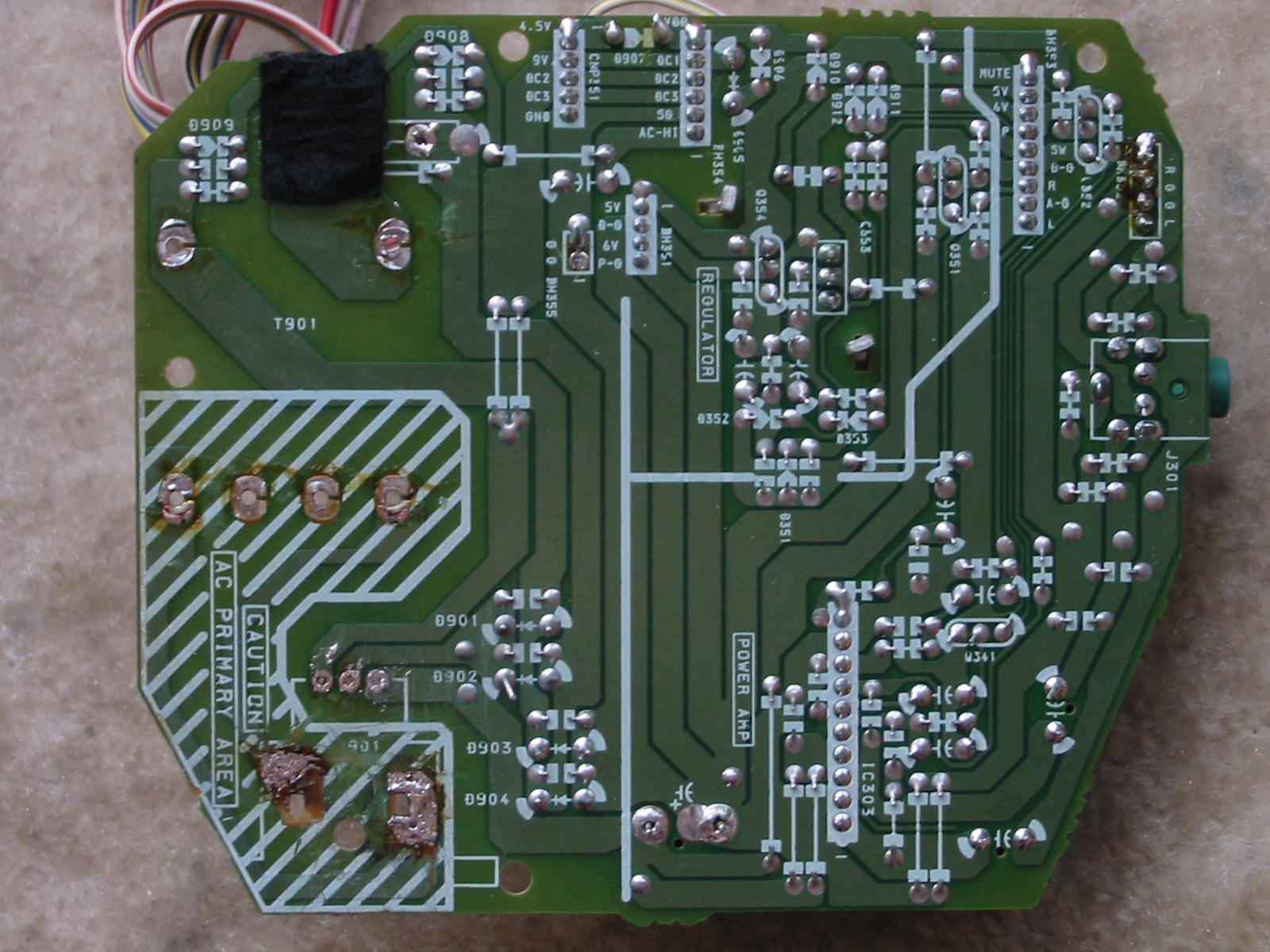 ) into 3-Ohm speakers with Vcc of 15V. But it also states that if Vcc is 9V or less, the IC can be used without heatsink, which is how it was in this boombox (this hints the original transformer was probably rated at 12V or less.) All in all, though, the LA4601 amp IC is really nothing to write home about. The internal speakers in the CFD-E55 boombox are rated 3.2 Ohms and 3 Watts max. Doing the math… a 12V supply used in single-ended amp application means 6V max for the positive or negative peaks. Of course, the speakers would never see that, because of the biasing and internal voltage drops in the amplifier. So, assuming 2 voltage drops @ 0.7V for each 6V “side”, this leaves us with 4.4V max peak (and even that is probably somewhat inflated, but not unreasonable.) With the 3.2-Ohm built-in speakers, the max possible power from 12V should then be P = ((V_rms)^2) / R = [(4.4^2) / 2] / 3.2 = 3.025 Watts RMS. (In reality, the power output would probably be even lower, but this is a decent “best possible” approximation.) Thus, it looked like a 12V power adapter should be plenty to drive the speakers.