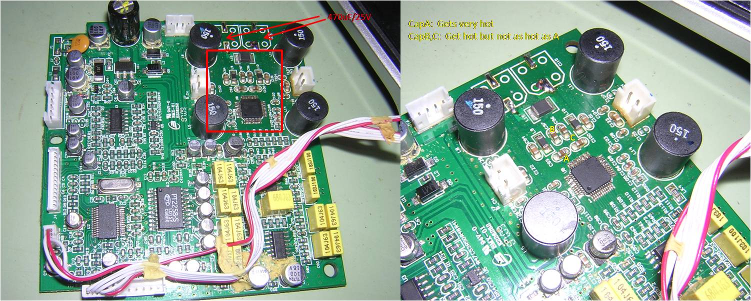 I put the 420uF original cap back in............still got hot. As best i can tell at the same rate as the other one.