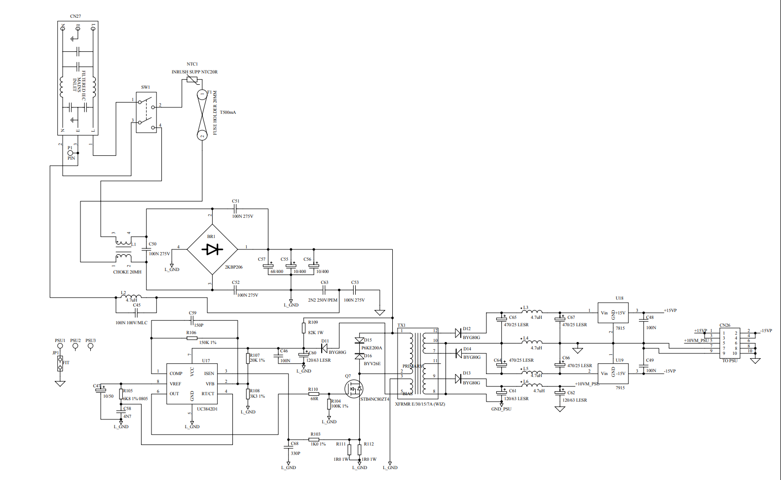 +10VM doesn't look like 10V for the sch drawn extra transformer turns, I wonder if it's phantom power. 25V caps for the 15Vreg input.