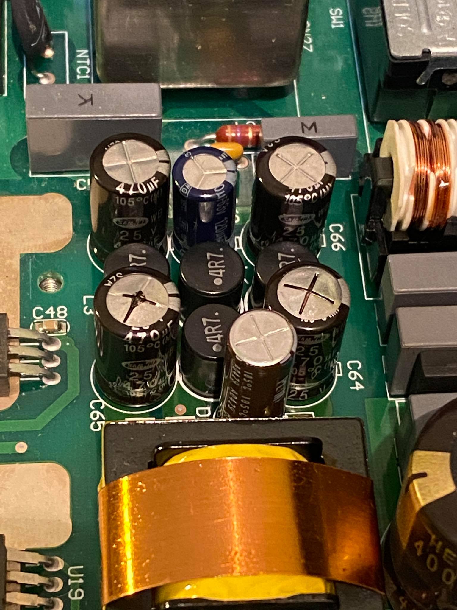 If we look at the photos of the PSU, we can see 2 caps are bulging a bit, and seem to have some burned black stuff on the top. I'm assuming they are not working. Is the possible reason for this the cap on their right side, position C61? It is not the same as C62, and it should be. I think someone might have replaced this one in the past, with an incorrect one, causing the following two to burn?