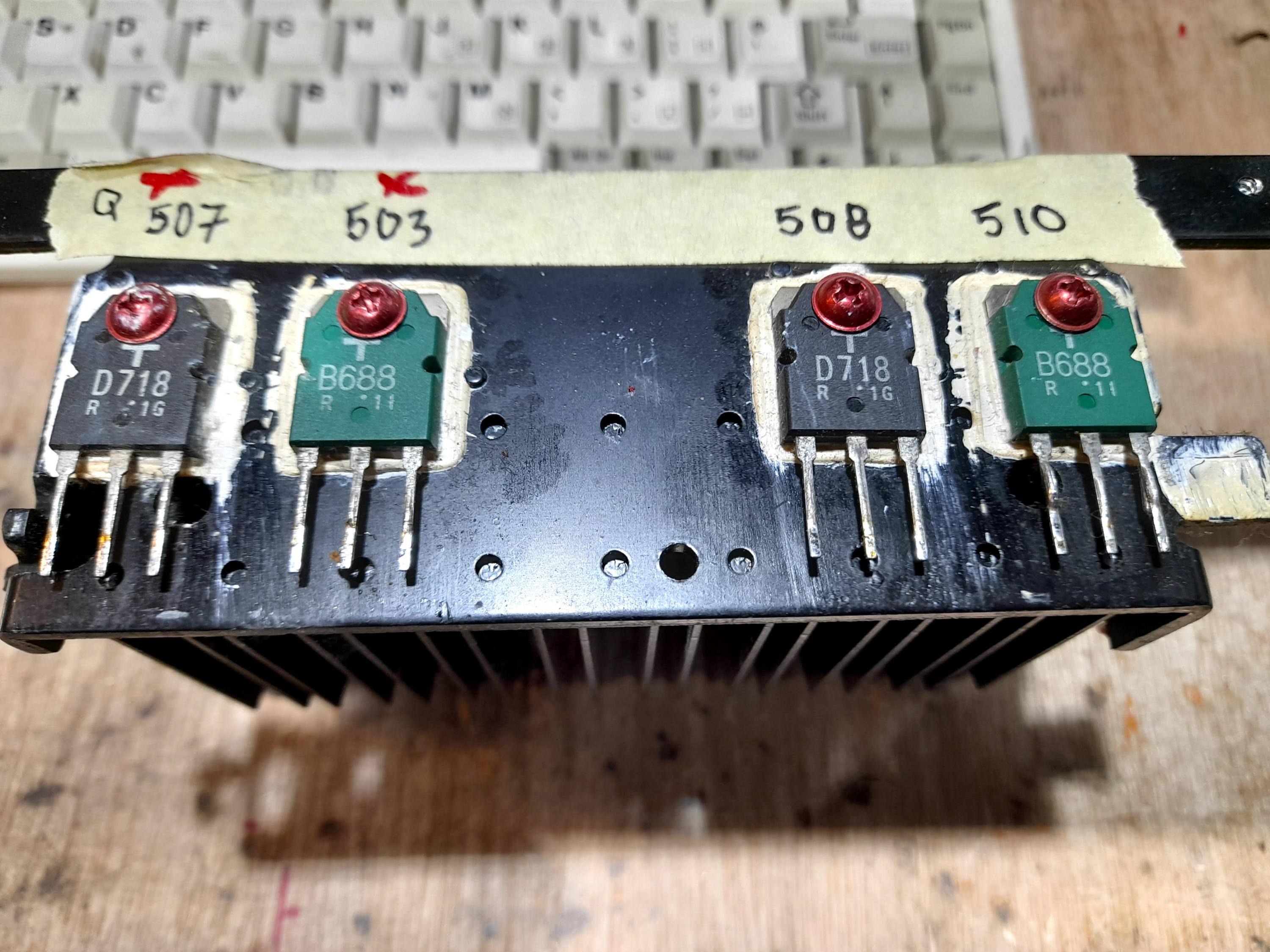 I've attached a picture of the transistors attached to their heatsink. Because of, what appears to be, overspill of heat compound, i'm guessing the transistors are not original.