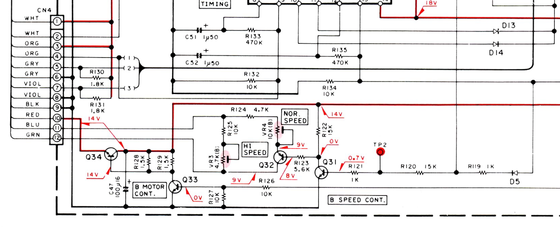 The speed is controlled by the resistance across CN4 pins 11&12. in high speed, Q32 is open so the speed is controlled by R125 and VR3. In NORMAL speed Q32 shorts connecting R124 and VR4 across R125/VR3
