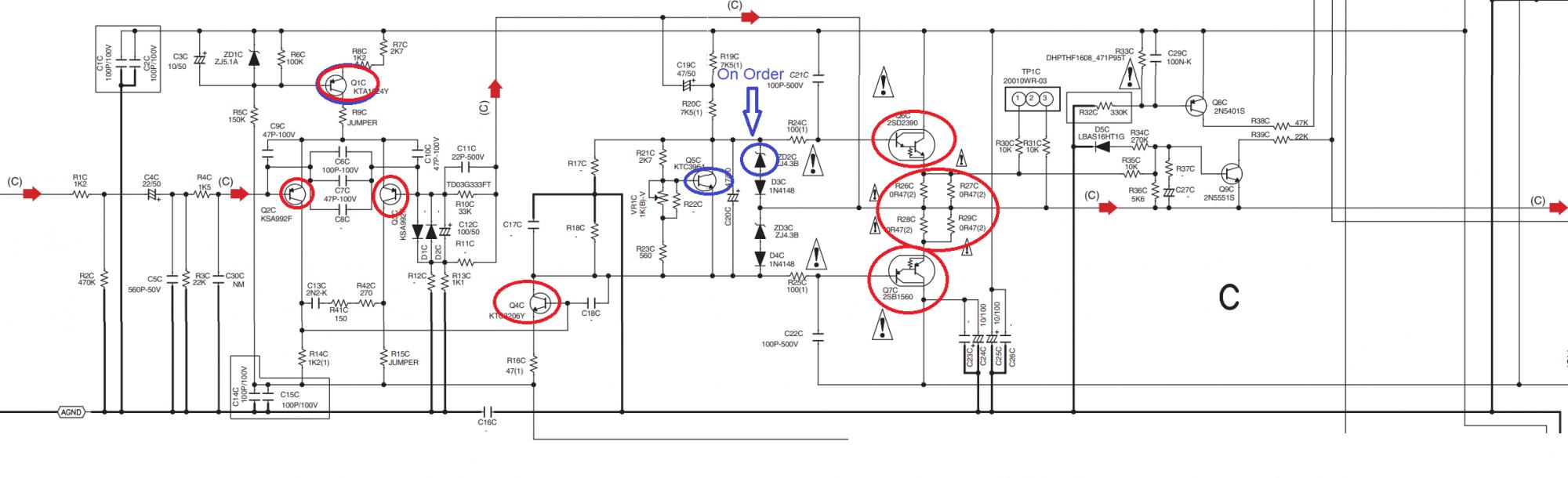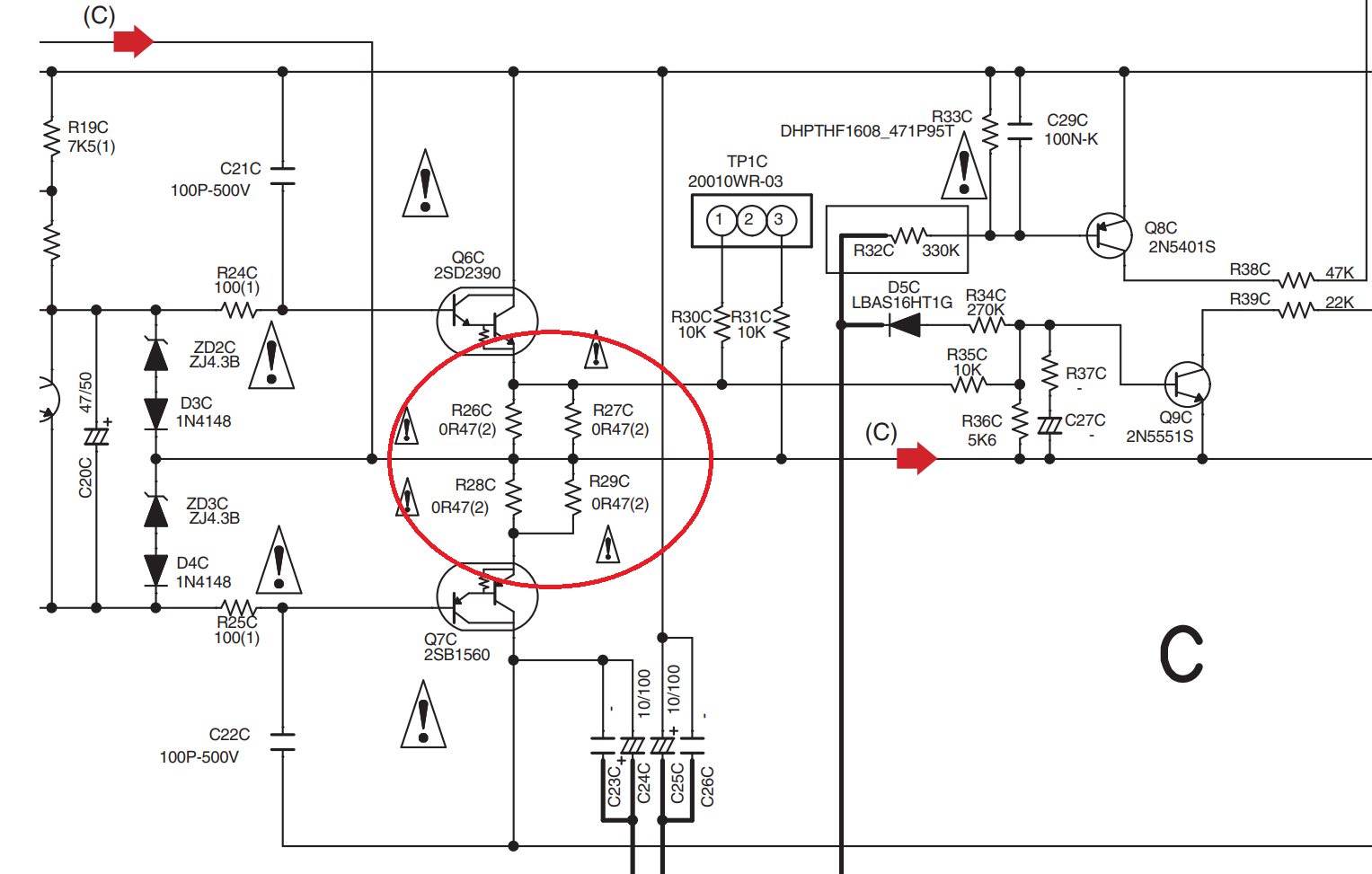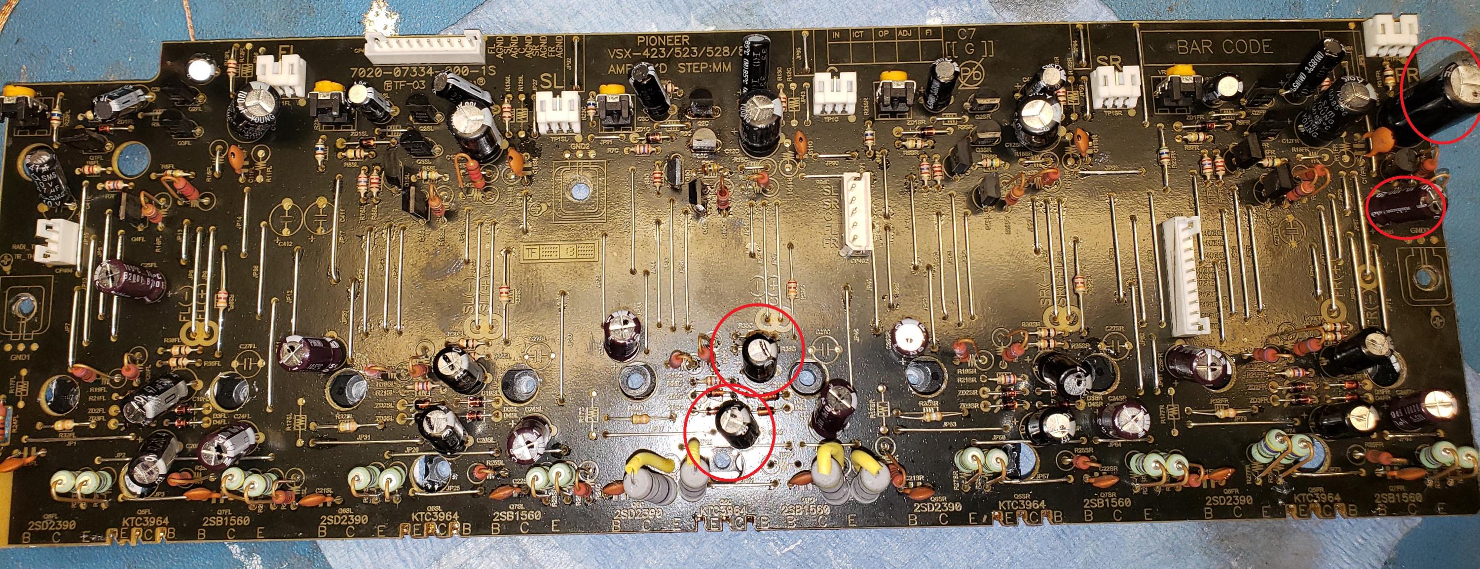 Replaced all, replaced A992 BJT, and pre-amp transistor and power transistor. I found 0.47 Ohm resistors that are blown or have gone High impedance and I'd like to replace.