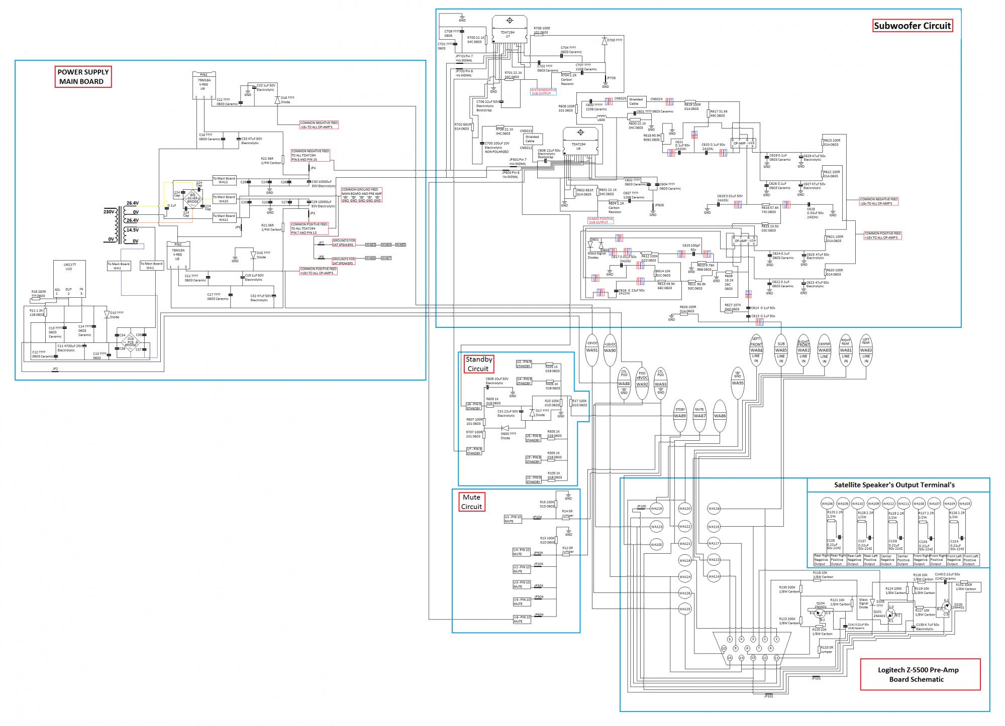 TLDR: One of the infamous Z5500 sets powers on fine but has no sound AT ALL, not even on the headphone jack. Need a bit of help understanding the schematic and principle of operation of the mute/stby circuit. Attached "original" and edited schematic. Control pod might be bad.
