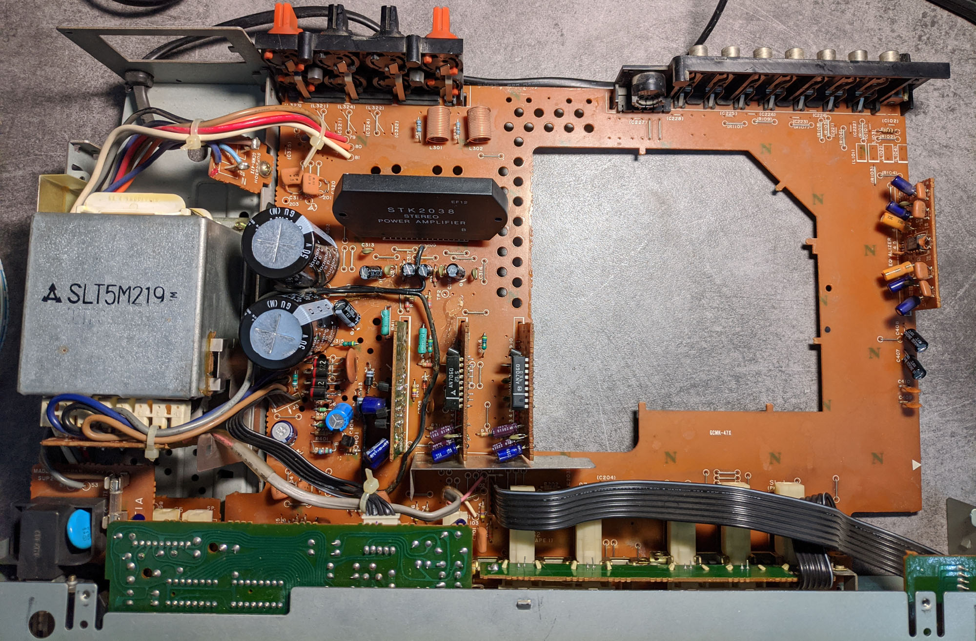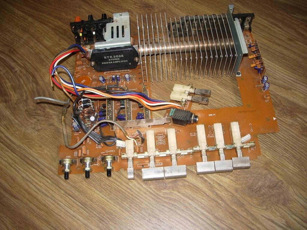 Unfortunately the amp uses the dreaded STK IC Here it is STK2038B (not to be confused with STK2038II , they are totally incompatible!) and the right channel is dead.