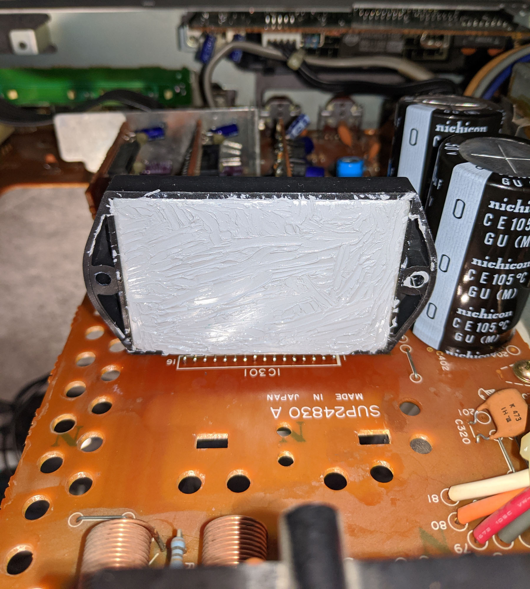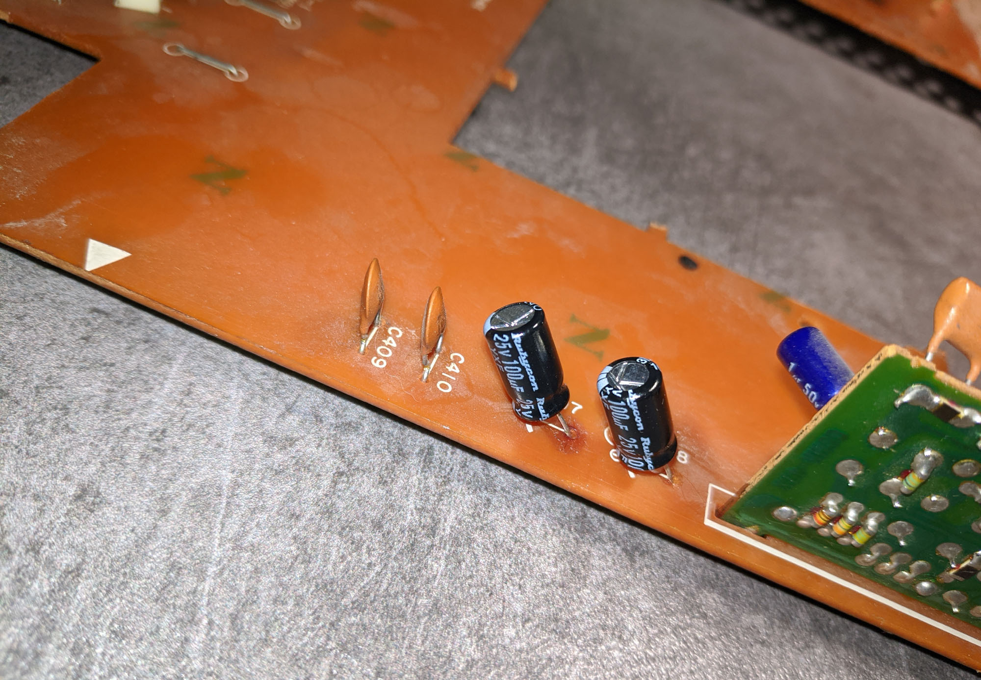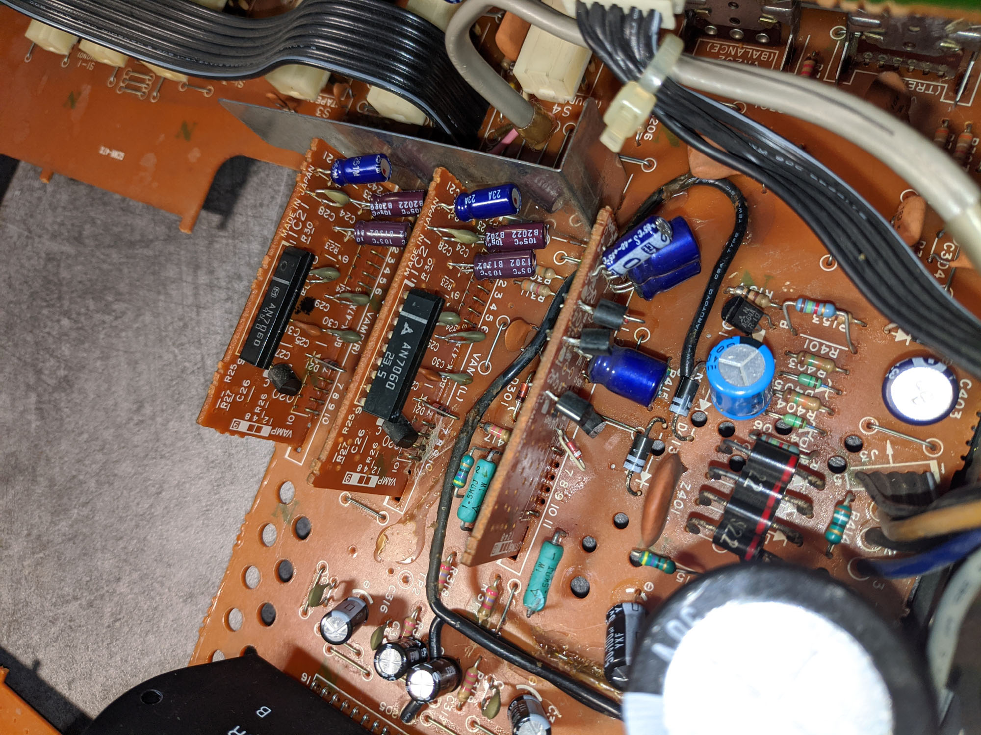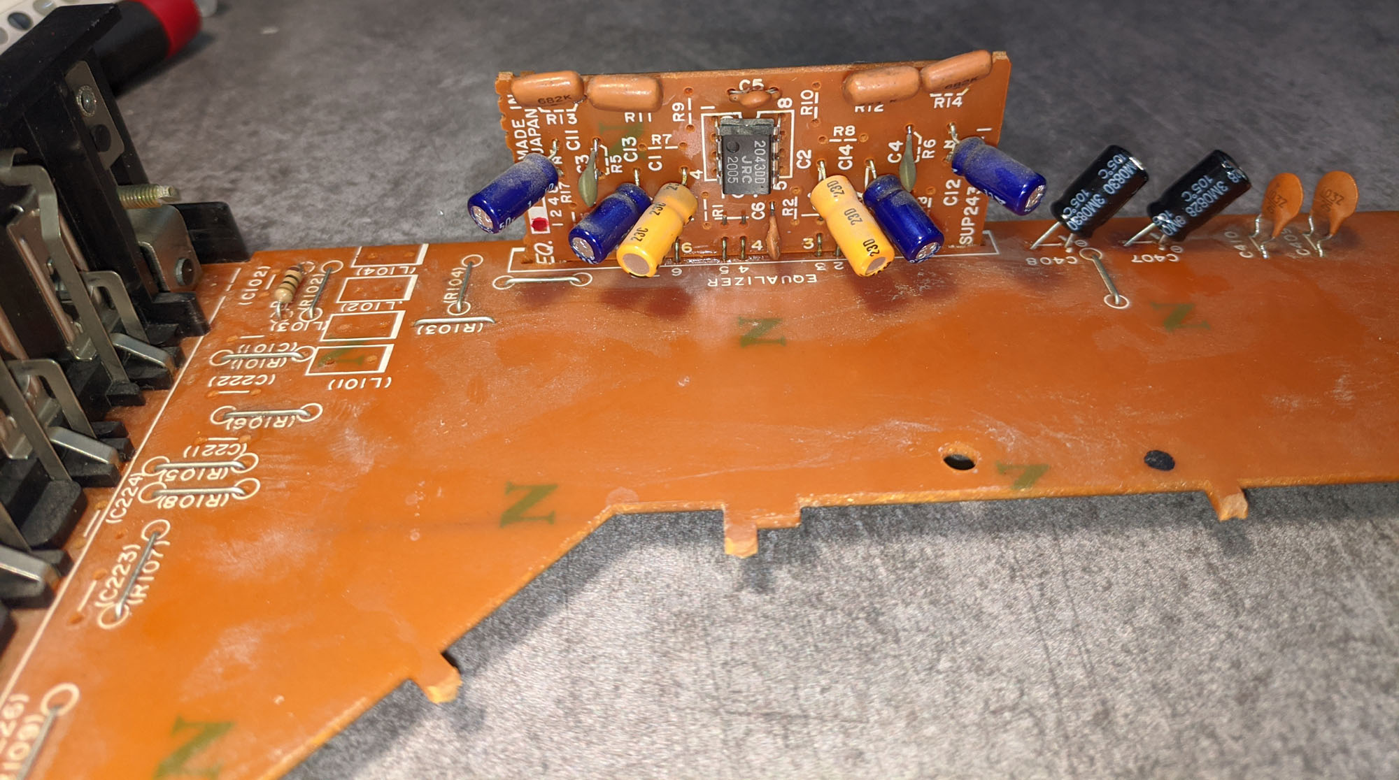 Caps had date codes of 1982, so I proceeded to preemptively replace most of them including the bad ones, using exclusively good Japanese brands 105c and entry level low esr.