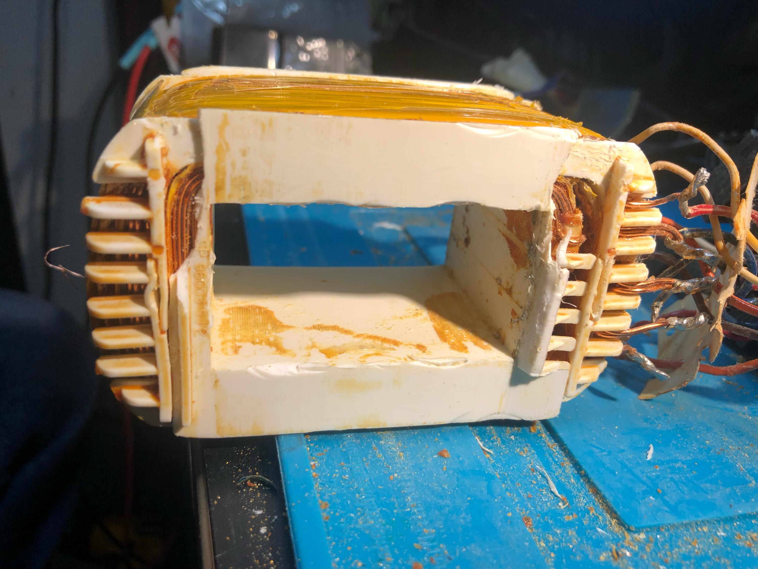 Just wondering if anyone has any experience doing a non-destructive tear down on a transformer like this one. I'm trying to get to the thermal fuse and was hoping it was possible. So far, not much success this appears to have been immersed in varnish during manufacturing. The plastic core housing appears to have been inserted from both sides when built, just not sure how to take apart without snapping the plastic core into pieces.