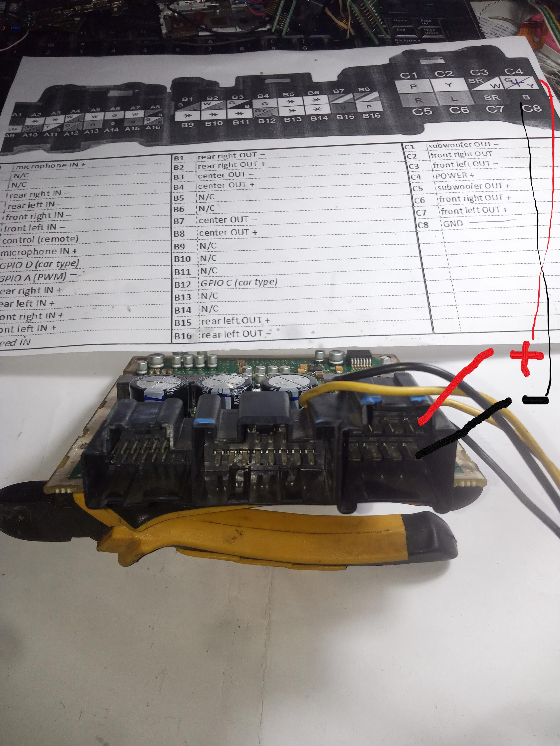 when connect the power to pin C4 + and pin C8 - it does not react, I think that you still need to use some kind of contact to turn it on, I found the pinout but I can't figure out what to use
