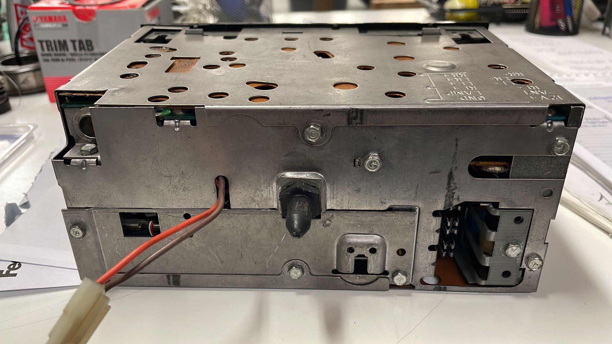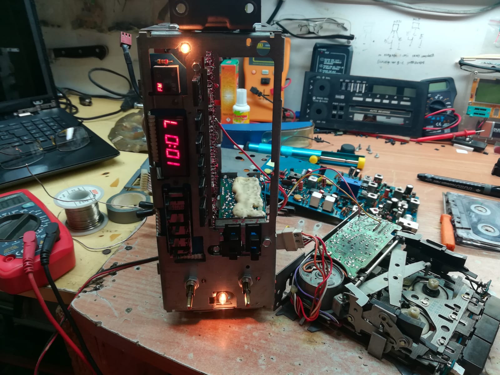 I am struggling with a complete restoration of a Delco GM car radio, I have already taken these car radios in the past but this is a bit more complicated and has many problems, in the meantime I ask if anyone knows the exact model in order to trace a possible repair scheme, I have if someone and they have it I would be very happy, I am attaching photos and I also ask what is the purpose of that two-wire connector that comes out from the back (orange-brown) the radio turns on with the display completely off, the mechanics make strange and non-strange noises accepts the tape, the audio is distorted on all channels, first of all I would like to start with the display off, I have only redone some soldering but nothing has changed, I have also found two faulty micro-lamps have been changed and now they turn on but the display always remains off, is it possible that it has something to do with the small connector on the back?