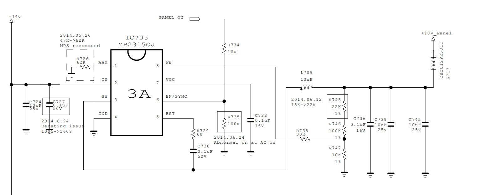Yes, it could break through the input with the output (internal Mosfet), check the setting divider for the output voltage is R745, R746, R747 and the recommended resistor R726 at 62kOm.