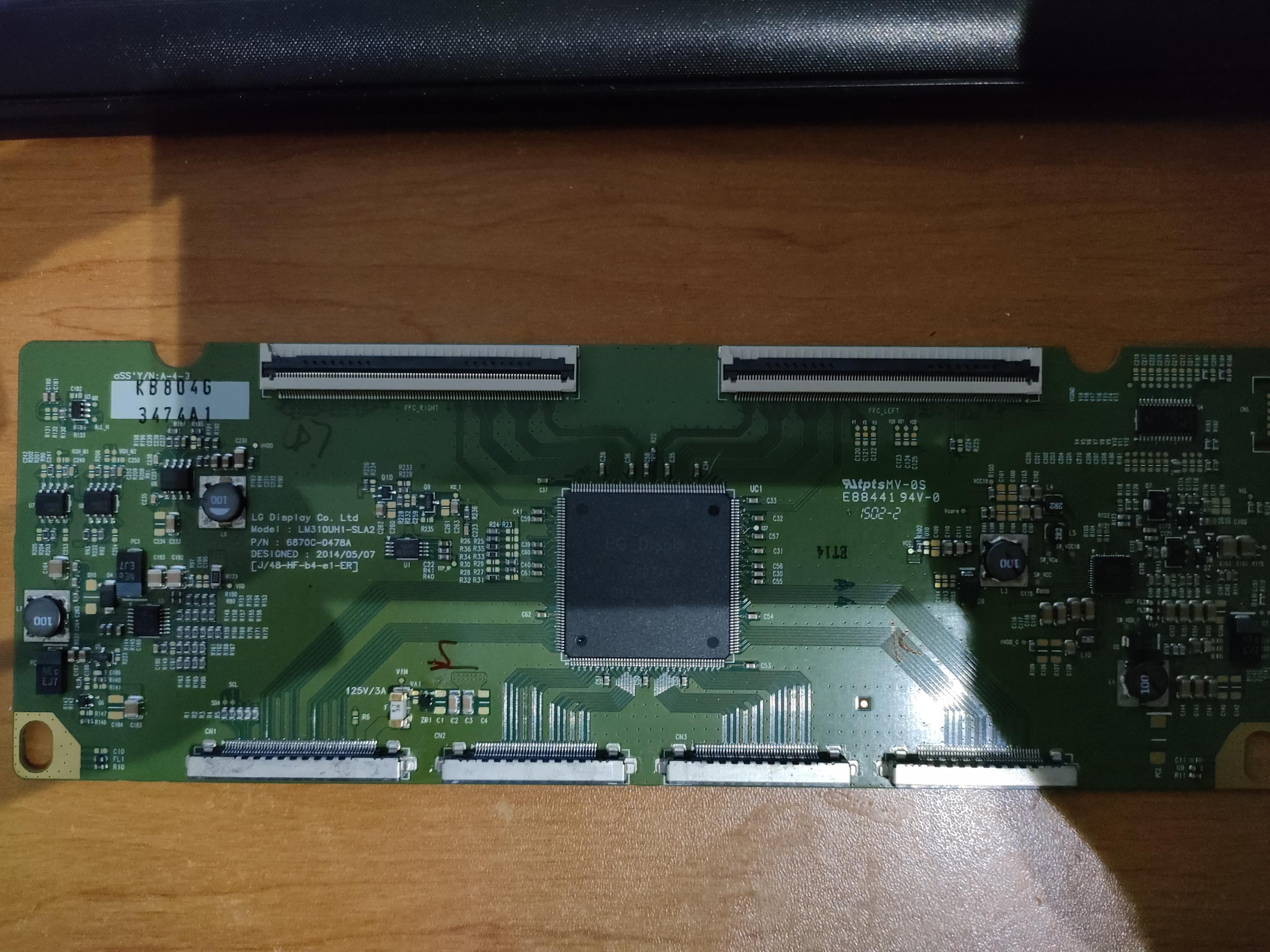 • TV came with vertical bars and no image. Found faulty TVS on left buffer board. Also replaced T-Con (may have damaged the original while hot air removing components, board has slight warp) and have full image but few horizontal lines on the screen. Some of the lines appears to be 2 pixel tall while others are 1 pixel tall.