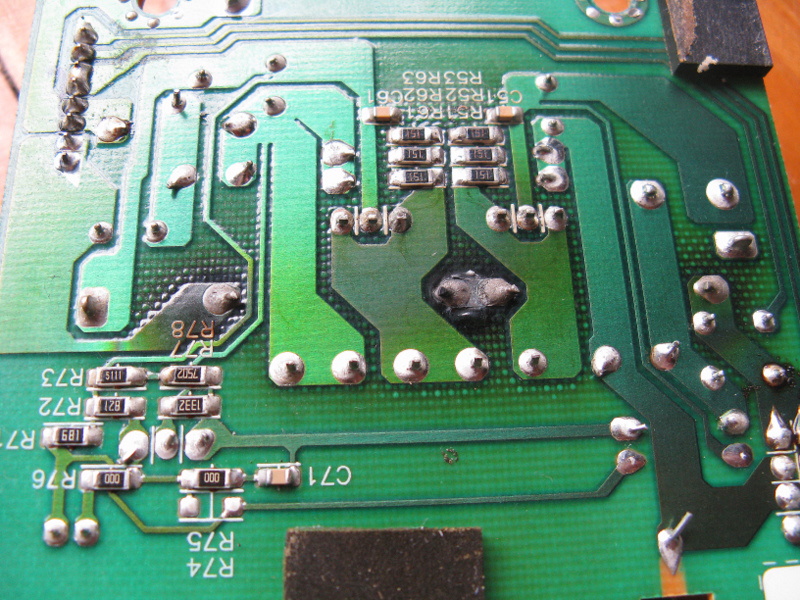 I see some pretty severe scorching of the PCB around the grey resistor (R56) to the left of the heatsink in the above shot.