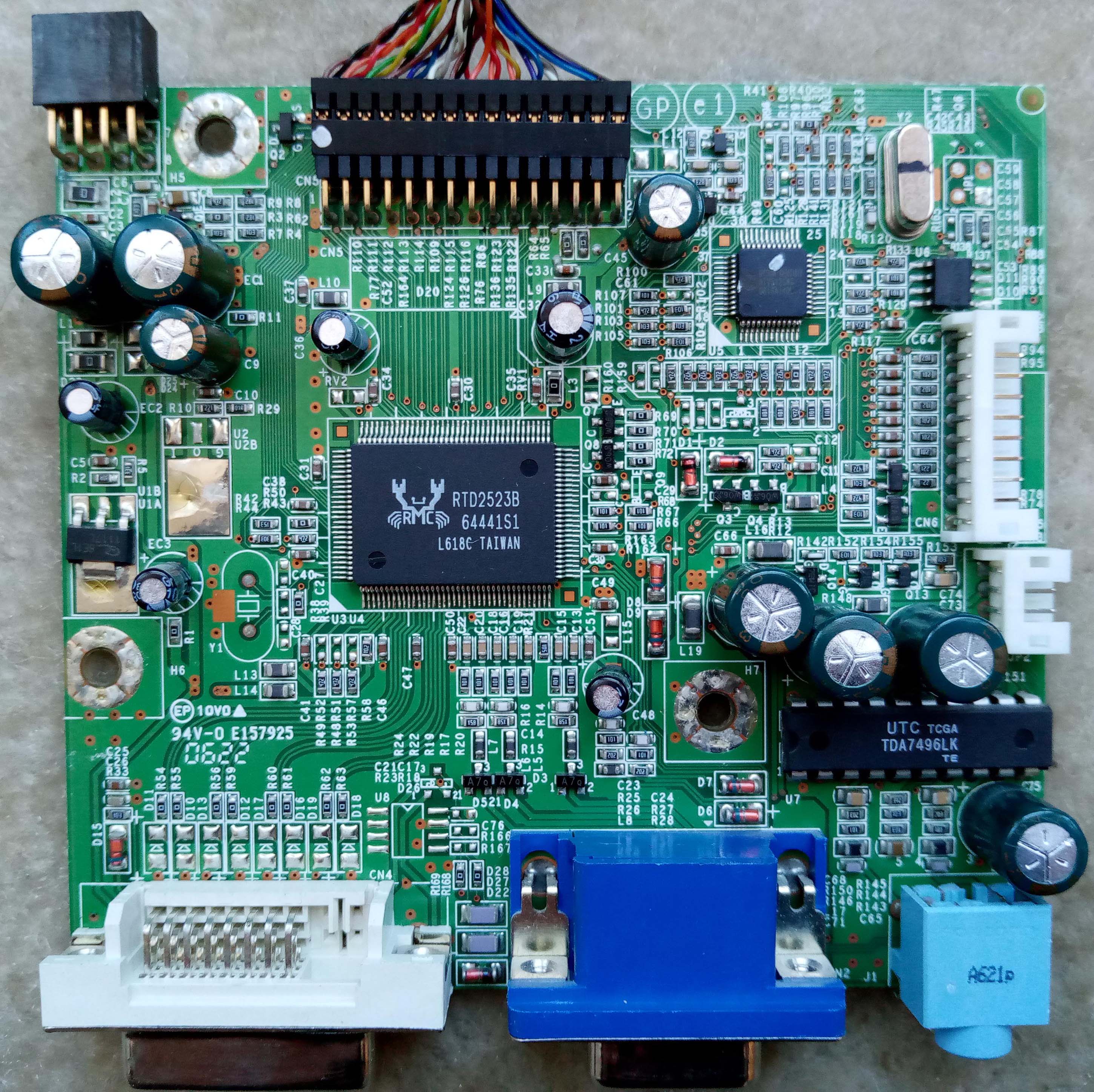 The 12V rail filter cap close to the TDA7496LK amp IC was also a Teapo SC @ 16V, 330 uF. I replaced that with an OST RLX 16V, 470 uF. I mean, everyone knows that low ESR caps tremendously improve audio quality, right. Never mind that the “speakers” in this monitor are just glorified headphone drivers… heck, their driver “cone” diameter is so small, I’ve seen headphones with bigger drivers. But whatever, I continued with this “more is better” trend and replaced the 16V 330 uF output coupling caps on the TDA7496LK amp IC with 2x 16V, 470 uF. One’s a Teapo SK 85C GP cap, and the other is a CapXon KM that I salvaged from… I don’t even remember anymore. I’m sure the extra 140 uF worth of capacitance will go above and beyond to improve the audio quality too. And lastly, the ripple rejection filter cap for the TDA7496LK amp IC: again, I went with a 470 uF cap. This time a Tocon –branded cap out of a Netgear mr814v2 router that was recapped preemptively over a decade ago. Actually, 470 uF is what was suggested in the TDA7496 datasheet sample circuit. So all of this 330 uF everywhere nonsense needed to go. :gfto: I think I also replaced one or two more 16V 10 uF caps with 100 uF Rubycon YXA, too. That’s about it, though.