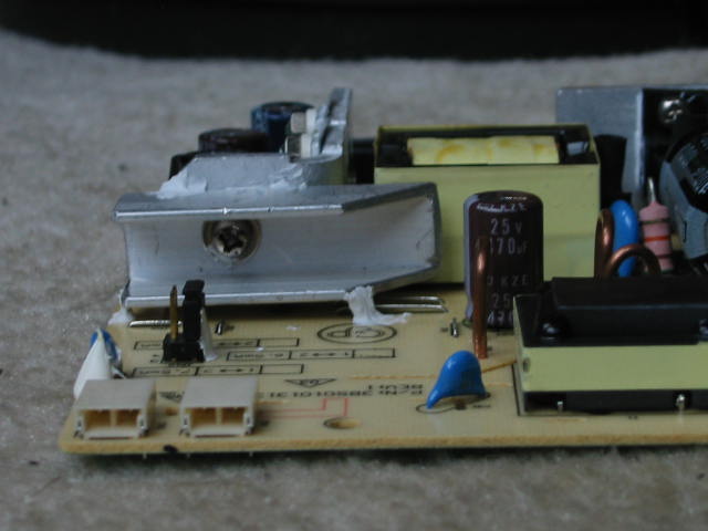 All it took was a scrap aluminum U-channel piece from my workbench, 1x M3 screw (from a recently scrapped plasma TV, if that matters to anyone ), a tiny bit of silicone/caulk, and… LOTS of fiddling to get a hole in the secondary heatsink drilled without removing it from the board. (Don’t even dare ask – that’d be a full 15k char. post by itself. )