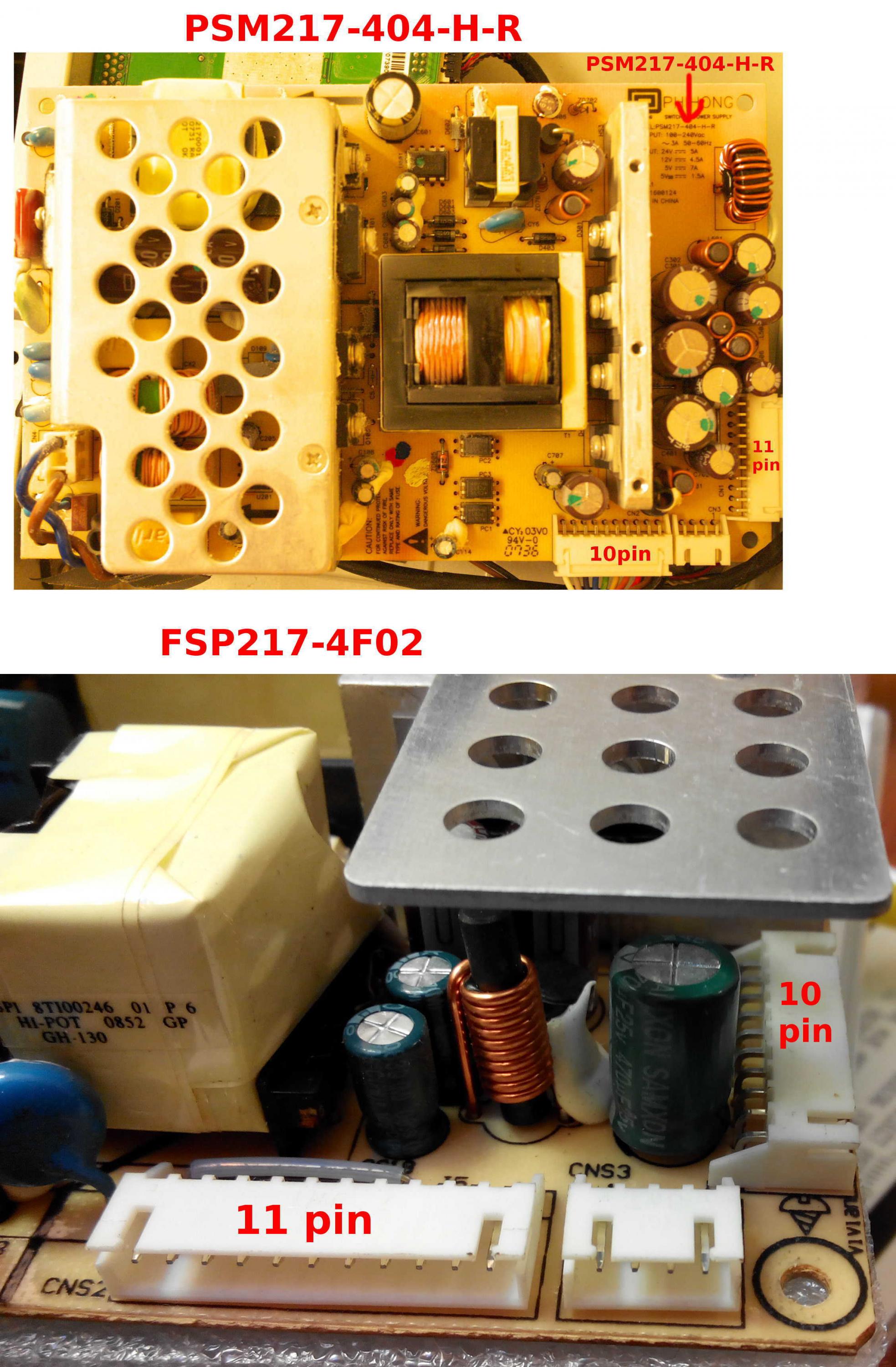 I still put the FSP217-4F02 in --I switched the connector cables and connected both 11 and 10 pin connectors-- and it actually light up the blue on/off indicator, which my broken PSM217-404-H-R failed to do so. However, there is no display at all -- When I press "menu" bottom of the Hanns-G281D, nothing showed. It now can sense computer boot up and change the amber light to blue light when active PC connected, but no video at all in either VGA or hdmi input.