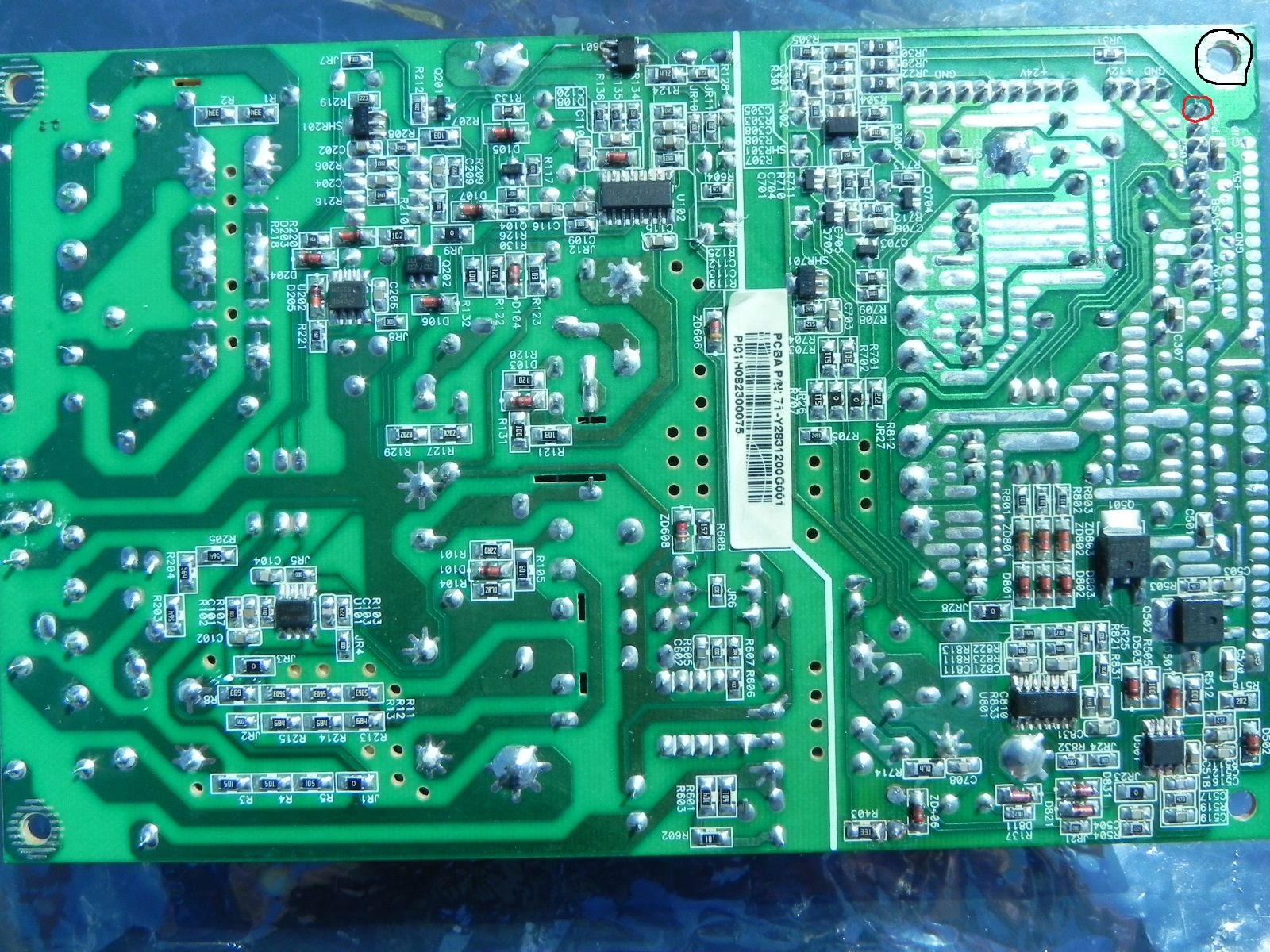 The only pin on the output connectors that has voltage is the 5vsb, it gets 4.97v. Last time I checked the 5vsb I didn't get a reading, but I did find a place on the board where a trace to a capacitor came up. The trace was very short so i was able to just jumper it with solder.