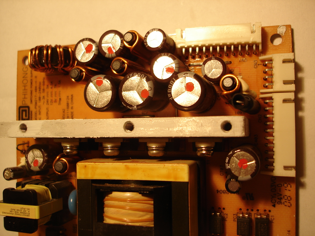 I inspected visually all caps on PS board (PSM217-404-H-R), they are look absolutely normal. Also I tested all big semiconductors, fuses, coils, transformers and resistors. Nothing found bad so far. If some body had similar problem with this issue please help. Thanks.