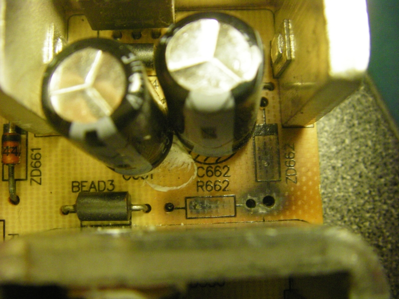 I also found 2 components that had released their smoke-packet contents. The problem I'm having is identifying these two parts. The first and most difficult is labeled on the board as ZD662. It blew with enough enthusiasm to shatter its glass casing and put a pit in the board. As such, the labeling is completely gone, leaving me without a way to identify its specifications. I assume this is a zener diode. There is another one around the corner with "44A" (8.2V, I guess) printed on the glass, but I don't know what forward voltage that means it has, nor if this is the same rating as the one that went poof.