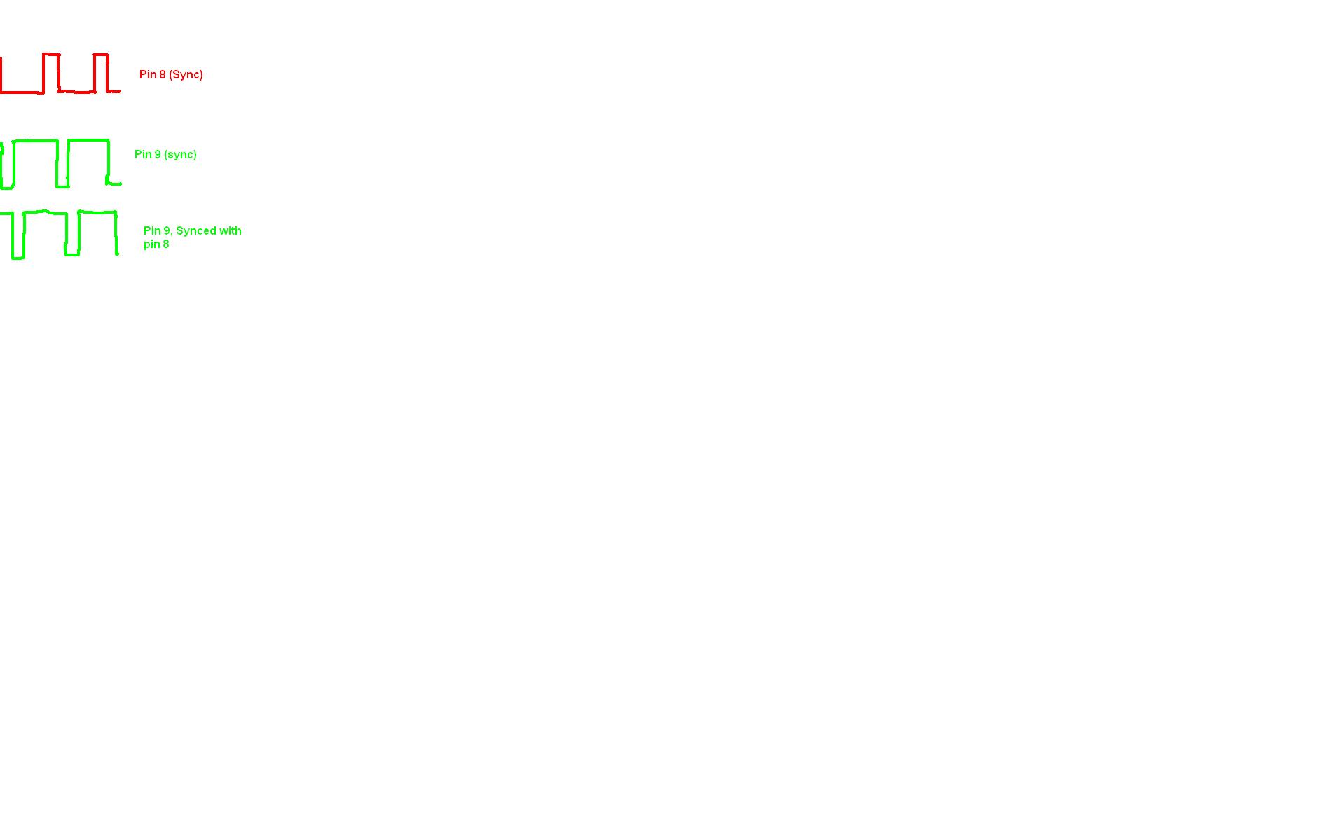 The first step is to get a reference drive waveform. It could be the output from pin 8, pin 9, or even the oscillator pin. Let's use the waveform at pin 8, which I assume is the drive for the N-channel FET. Now we want to see the waveform from pin 9. But we want to see the two waveforms as they exist at the same instant.