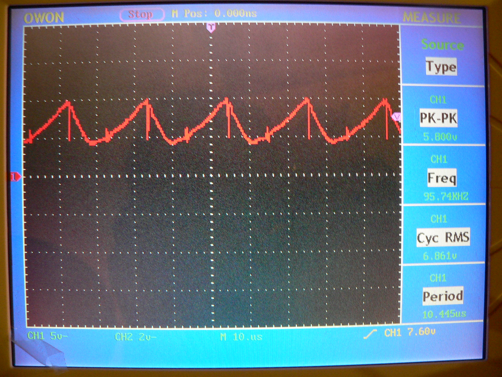 IIRC, the freqency of both the drains of the FETs and the ripple in the power supply are around 94KHz. I can re-measure this tonight.