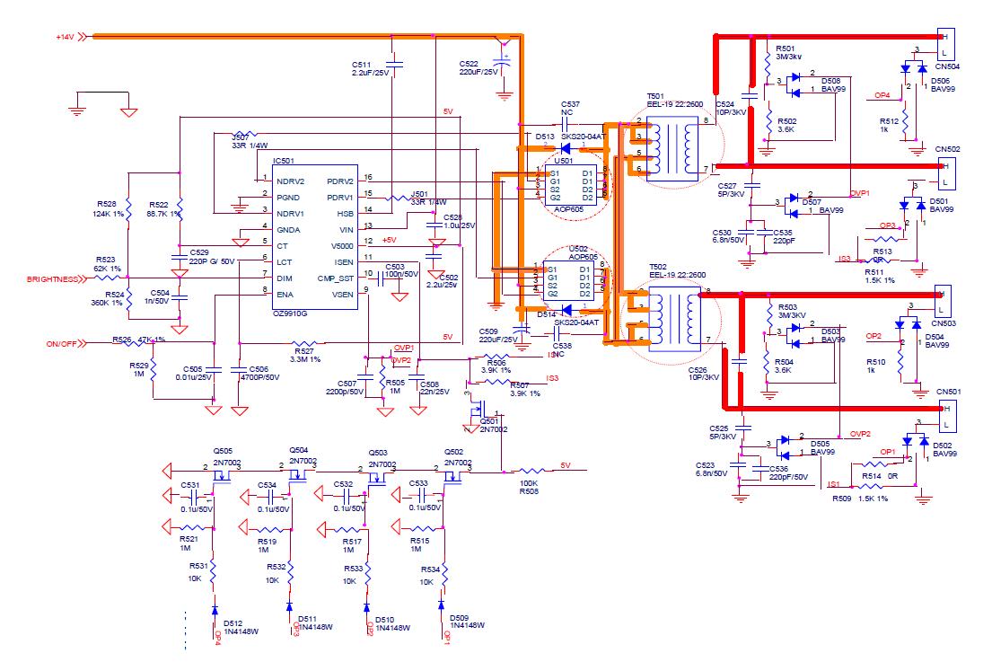 Setting my meter to 150V AC I tested the ccfl connectors. I put each probe on one of the pins by the ccfl connector. CN501 and CN502 show 75V when they light up. CN503 shows 60V, and CN504 shows 50V.
