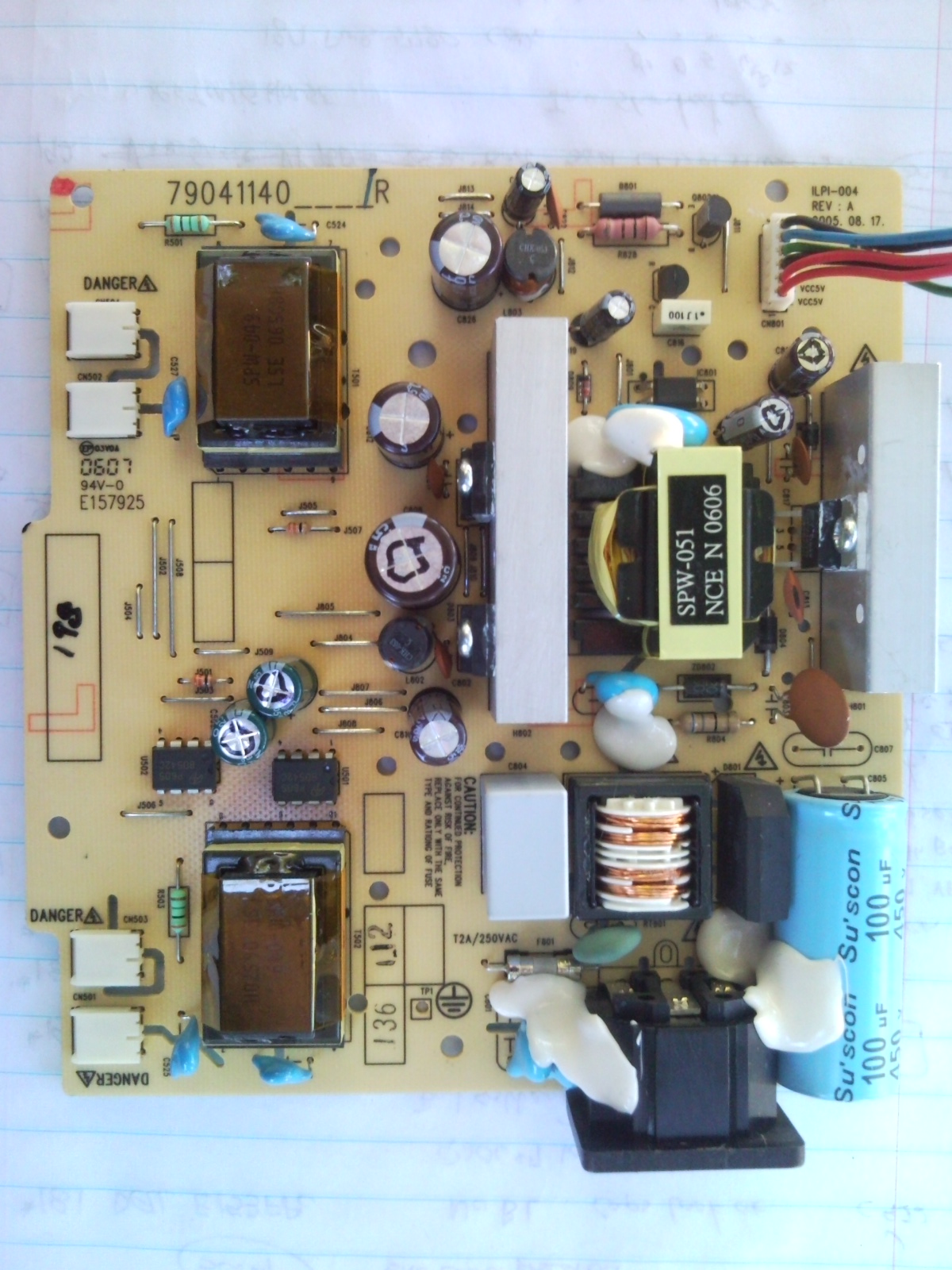 This was showing 2 seconds to black. I opened it up and found 3 bulging caps. (the three with black marks on top in the inverter side.) I replaced them with good caps... no change. I then removed the rest of the caps and tested with ESR meter. Found two of the smaller caps near the main transformer reading high, so I replaced them also. Still get 2 sec to black.