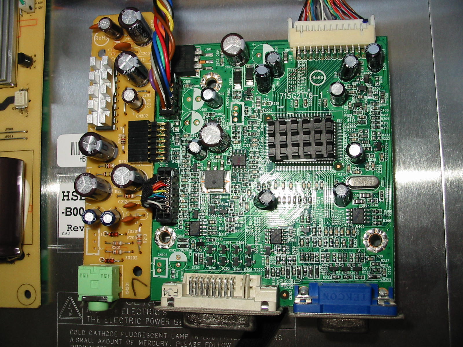 As for the rest of the monitor, everything else seems to be fine. I checked the 3.3v and 1.8v regulators on the video board as well as the 3.3v regulator on the panel board, and they all seem to be putting out the right voltage. Disconnecting the video cable between the video board and the panel board gives a white screen, as expected. I've also partially recapped the PSU/inverter board (with proper equivalent low ESR caps) just in case, even though none of the original caps seemed failed or heat abused. The caps on the video board are a mix of Rubycon and United Chemicon.