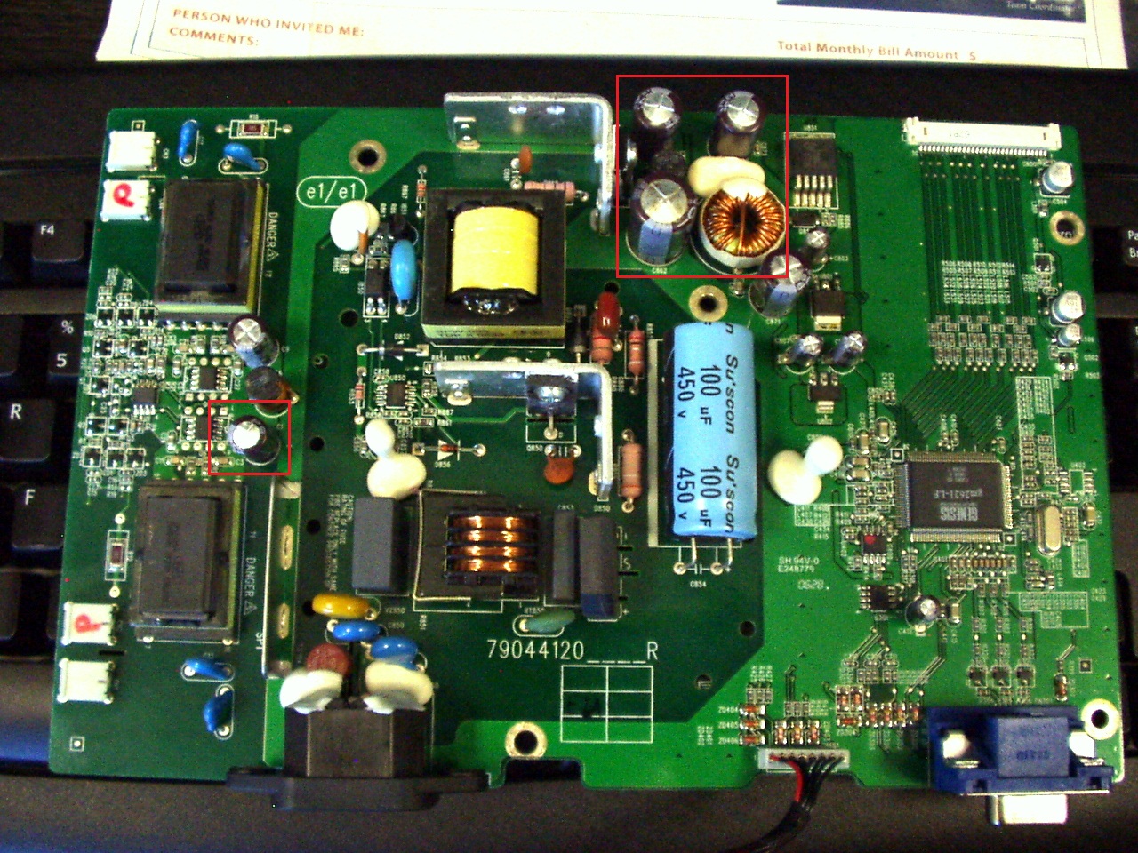*If you reference the picture the bulging caps are C864, C869 (470uf 25v), C862 (1000uf, 25v), C1 (220uf, 25v). 864, 869, & 862 are the three barrel caps straight up from the big blue 450v cap. The other is on the left side.