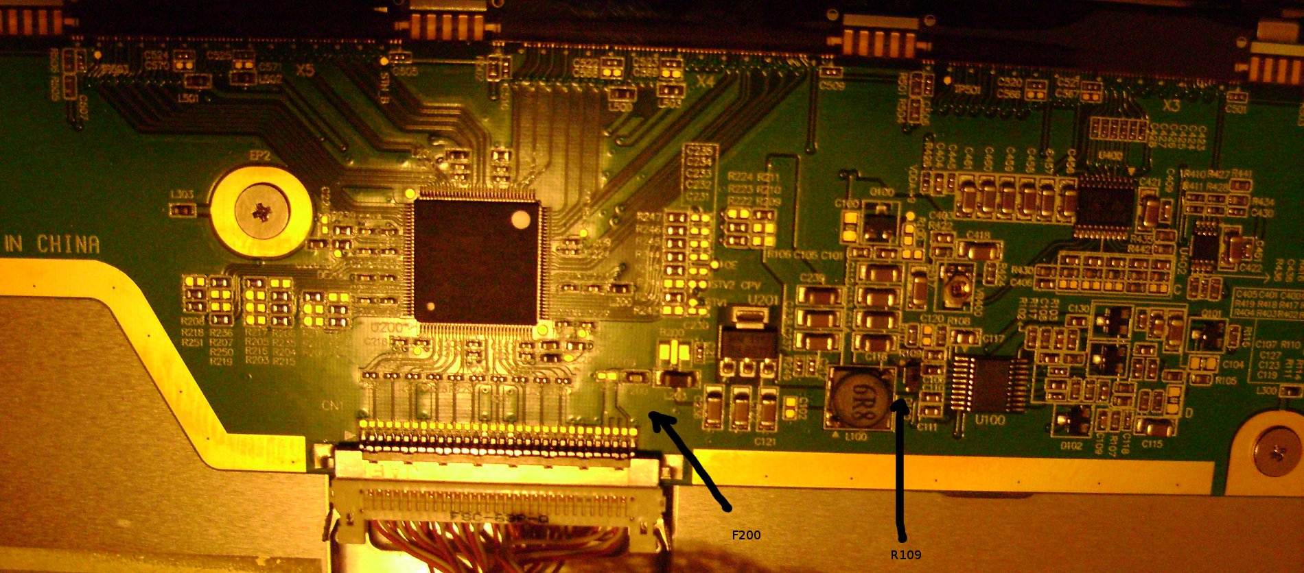 Yes, white screen was before and after. Also, same when I disconnect long panel control board. On it, there is one named F200 (as far I see, only one marked with Fxxx there). How to safely check if it is the culprit (it does not look busted)? What specification fuse do I replace it with? No need to look too professional, I might solder an external one.