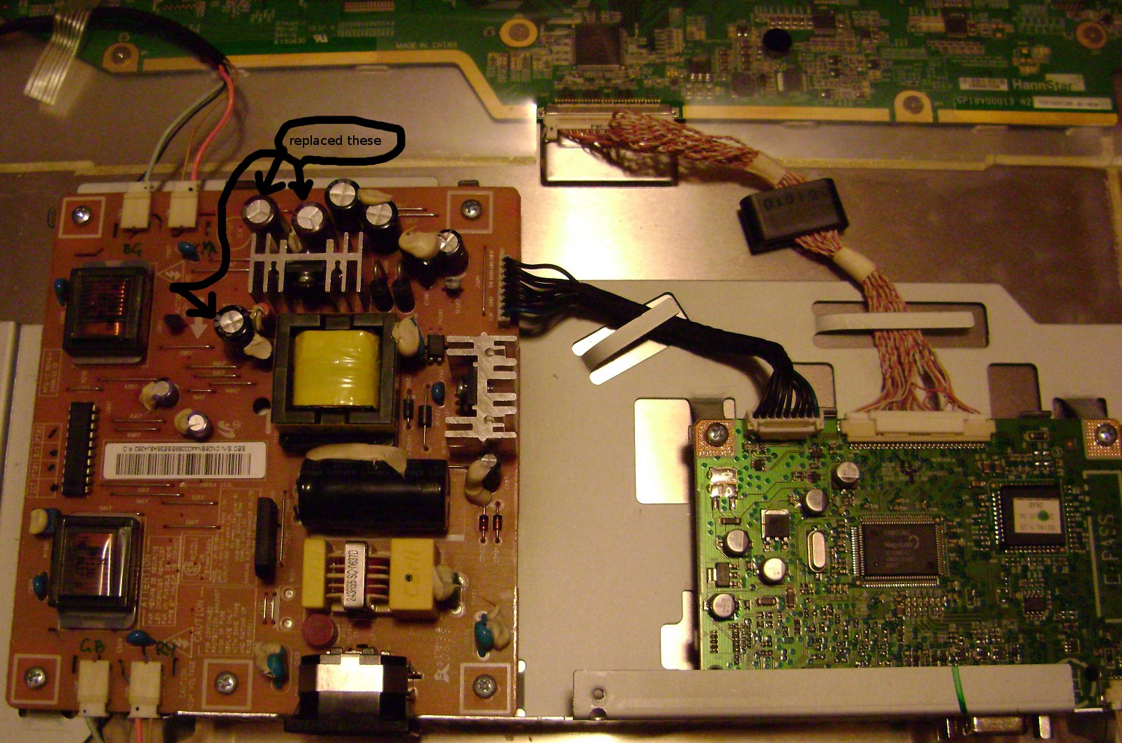 I have this Samsung Syncmaster 920n who powers on, but only backlight - screen is white and there is no image. I've recapped the PSU, replaced 2x 820/25 1x 330/25 using new decent caps - no luck. I've also read here that some similar models need replacing a fuse which I just can't find. Anyway, here's a picture, any ideas? Better resolution on request.