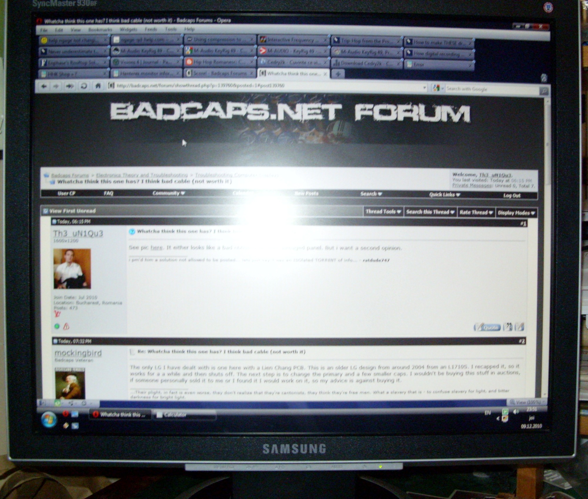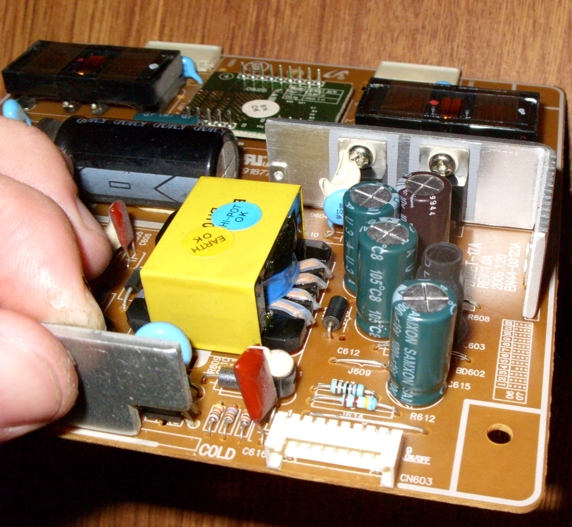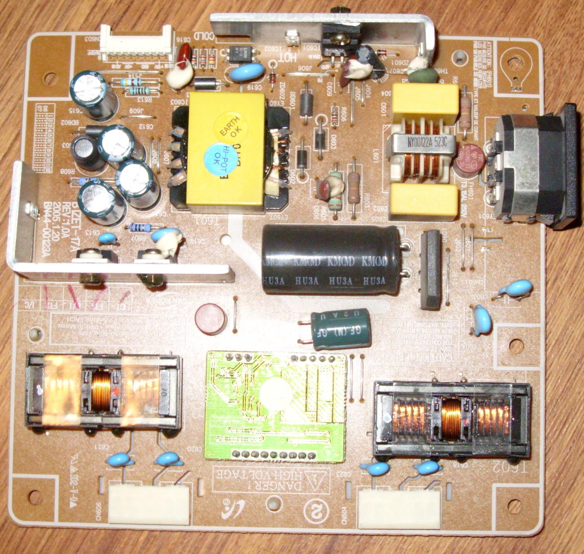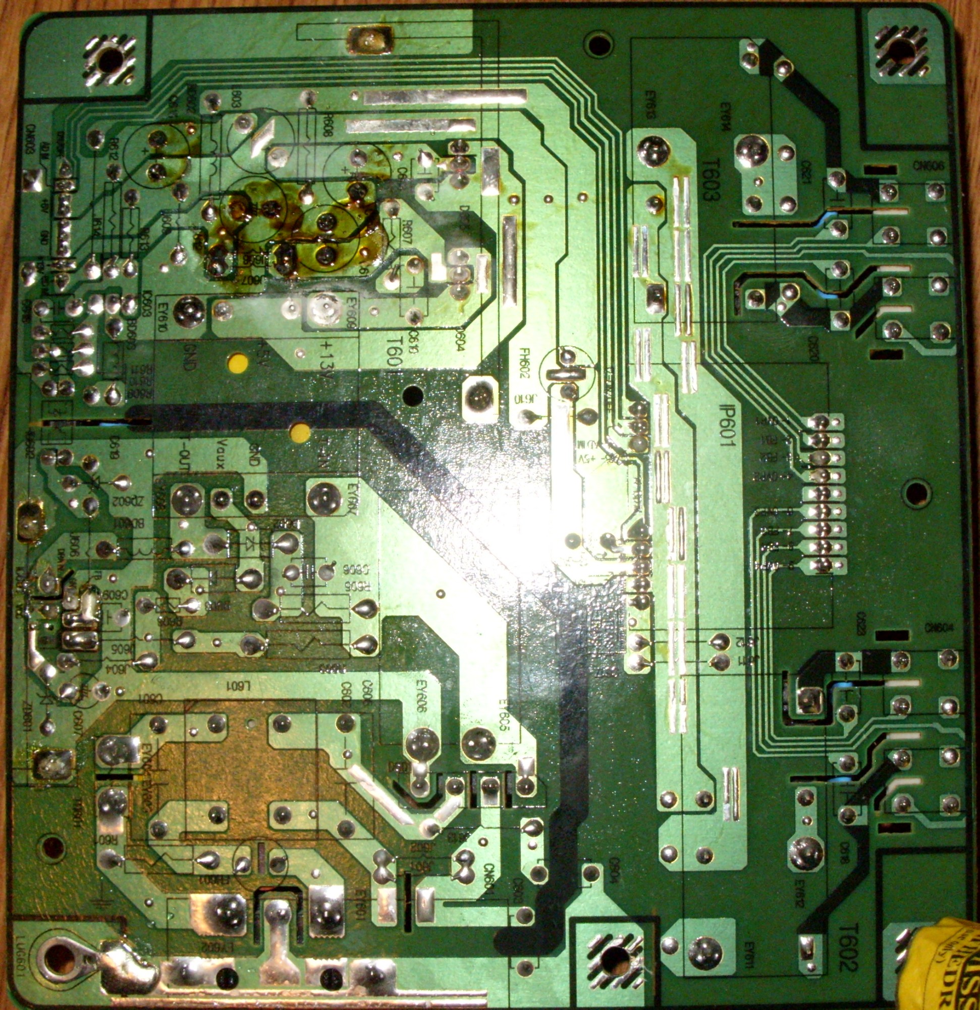 50 bucks for this. Samsung Syncmaster 930BF, pristine condition, never opened. Fault: no power. Fix: ONE capacitor. First cap on the 5v rail, before the filter coil. Green Samxon, didn't bother to read the series. 16v 1000uF. Replaced with Nichicon PL 10v 1000uF. All other caps tested fine. I've seen the same type of Samxon cap gone bad in the same position, in a LG Flatron of the same size. Makes me wonder whether someone doesn't know how to read datasheets, or they do it on purpose. But who cares, it got me a cheap and easy to fix monitor, so i'm not complaining. Put the thing back together, and... we have power! But oh my it's got a buzzing power supply. A bit of lacquer will fix that tomorrow.