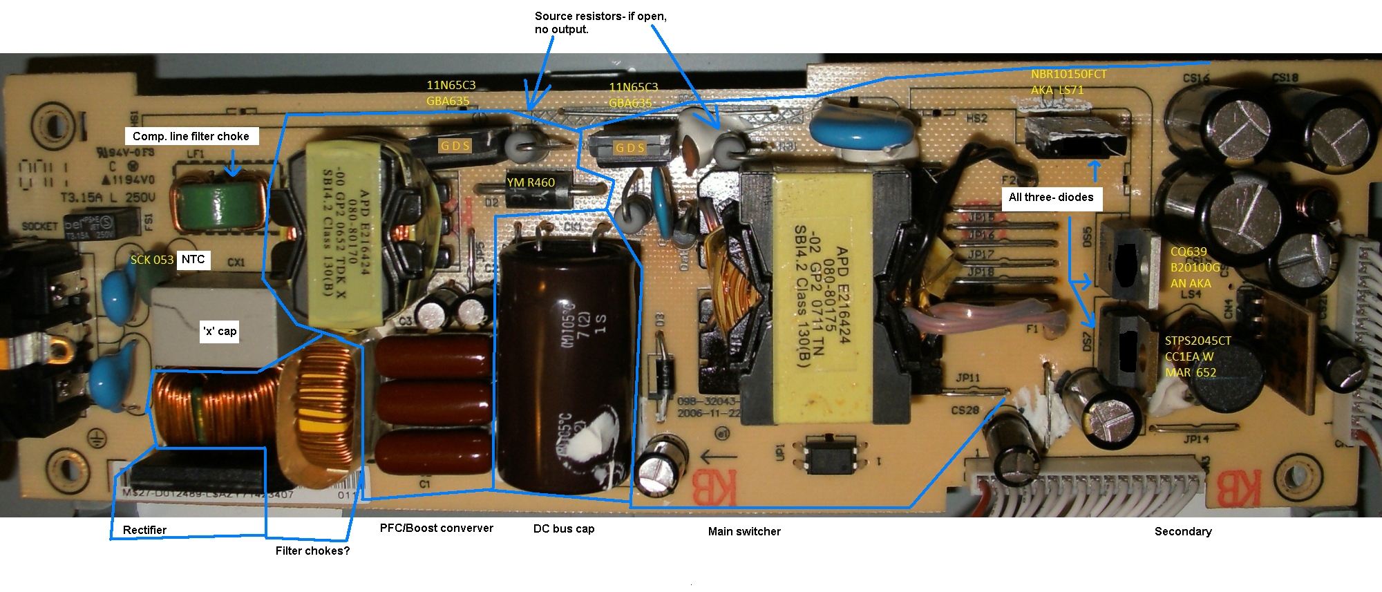 - Check for mains voltage (like 120V or 240V DC) at the main filter capacitor at 1.4x the line voltage. (Do I set the meter to 600Vdc and measure between the two large cap wires?)