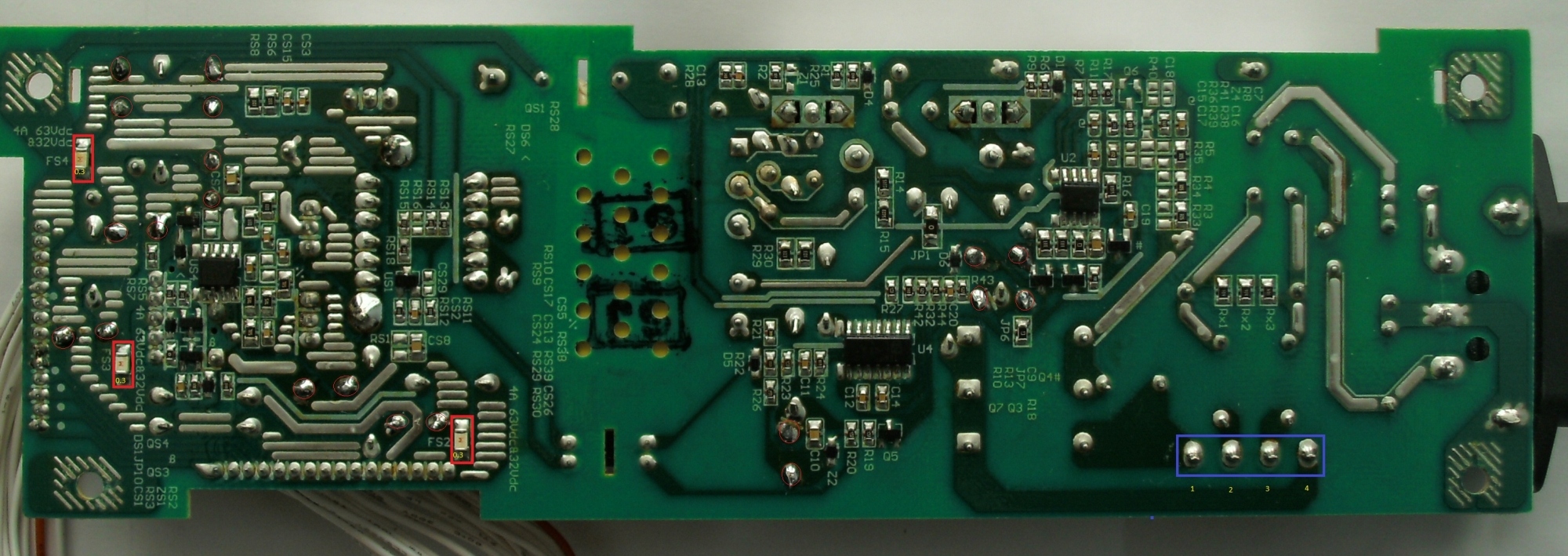 - I checked the 4 bridge rectifier pins circled in blue on the back of the board for short as described in another thread. I numbered the pins 1-4 and placed my multimeter on 200 ohms. With power off and board removed, I measured pins 1-2, 1-3, 1-4, 2-3, 2-4, 3-4, and in reverse. My multimeter read 1 for infinity in both directions on all pins; no readings were under 30 ohms.