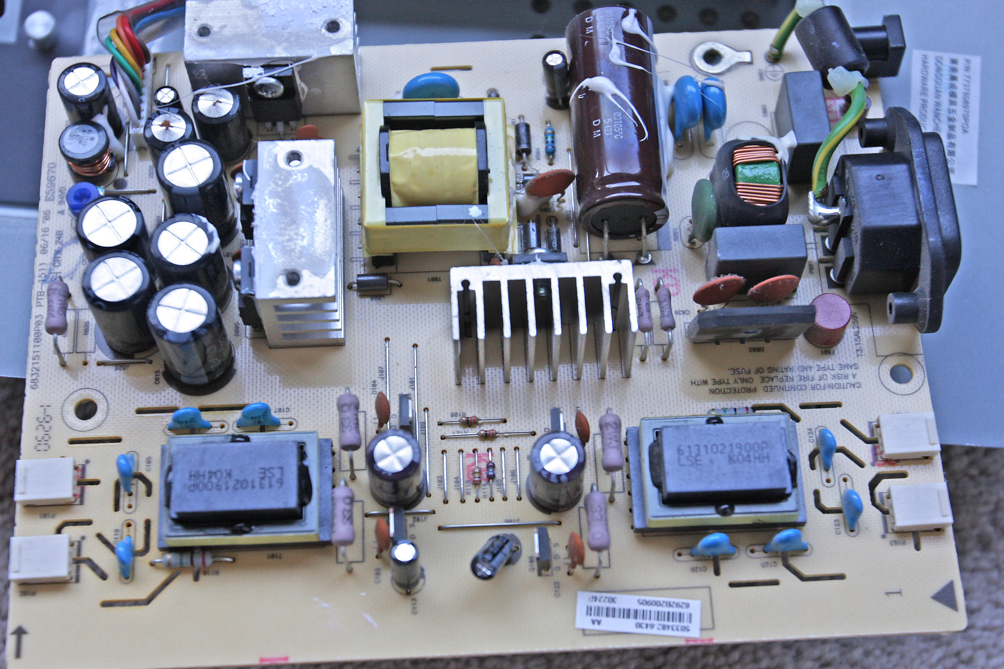 Once you get it apart (pain in the ass) it has the usual power supply/inverter with bloated Capxon KF series. Not nearly as well-made looking as the 1703 was.